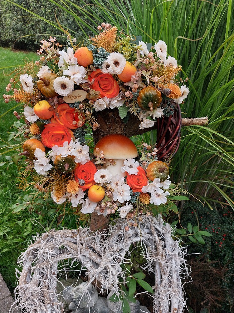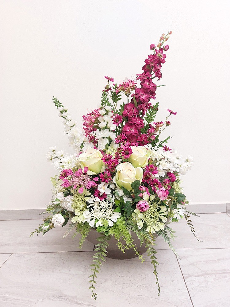 Květinová dekorace v šedé keramické váze se smetanovými růžemi a pryskyřníky Podzimní sleva 695,00 Kč 945,00 Kč