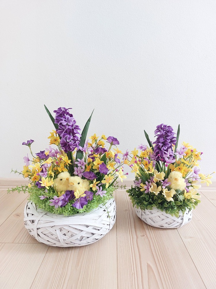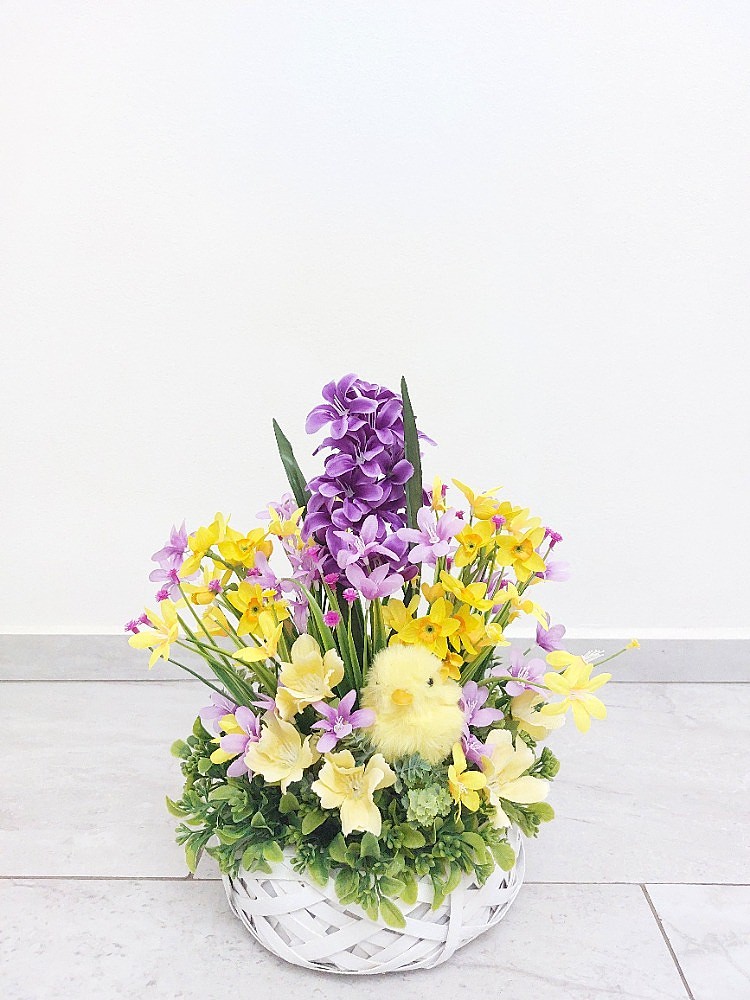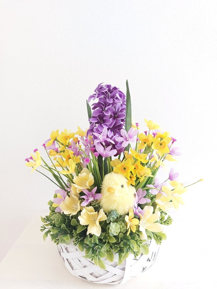 Ručně zdobená jarní dekorace v bílém proutěném hnízdě o průměru 20cm. Dekorace je vsazena do aranžovací hmoty pro suché aranžování a je osazena zelenou skalničkou v kombinaci drobnokvětých fialových a žlutých kvítků, žlutých narcisů a tmavě fialového květu hyacintu. Doplňkem dekorace je textilní kuřátko. Materiál látkový a umělý.