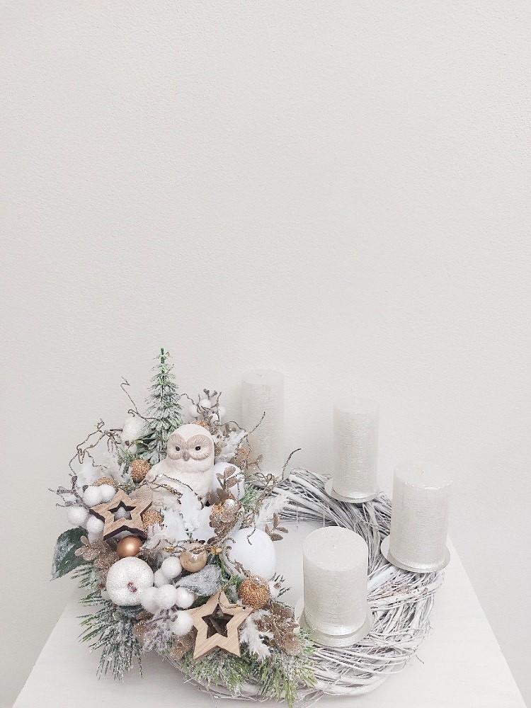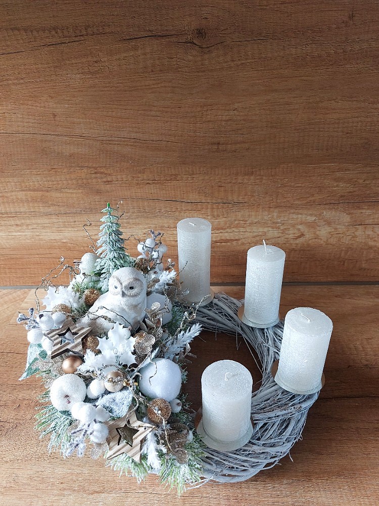 Základem adventního věnce je bílý proutěný korpus o průměru 30cm s dekorací 35cm. Věnec je osazen ojíněným borovicovým jehličím v kombinaci umělých a přírodních přízdob, které tvoří bronzový eukalyptus, přízdoba, bílá pampasová tráva, cesmína, bílé bobule, ojíněný stromeček, brokátová a bílá jablíčka, měděné kuličky a dřevěné hvězdičky. Dominantou věnce je sova vyrobená z polyresinu. Materiál umělý a přírodní.