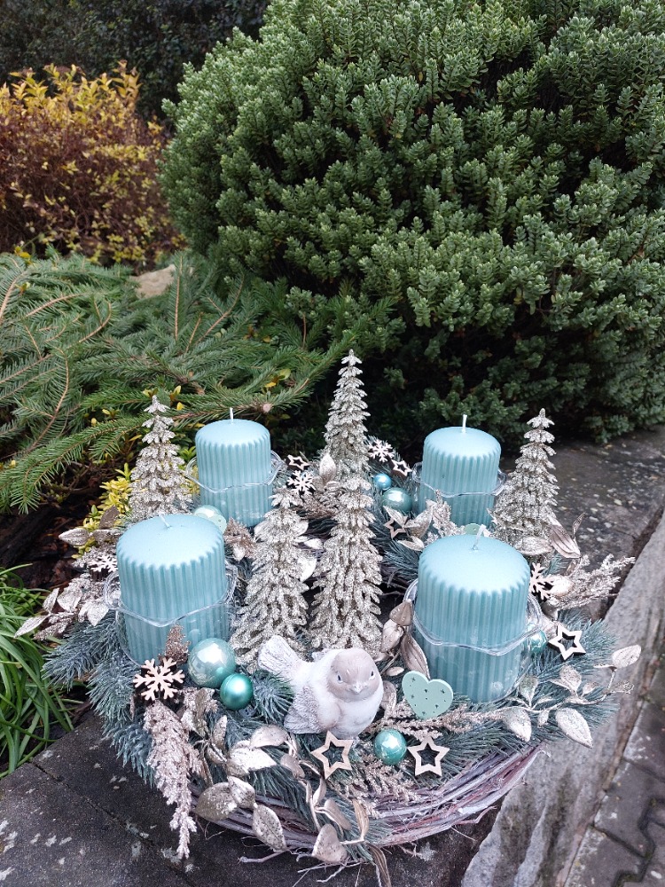 Základem adventního věnce je proutěný ručně pletený korpus o průměru 30cm s dekorací 35cm. Věnec je osazen umělým jehličím, zlatou přízdobou, eukalyptusem, umělými stromečky, skleněnými zelenými kuličkami, dřevěnými vločkami, dřevěnými srdíčky a hvězdičkami. Doplňkem věnce je ptáčkem vyrobený z polyresinu a dominantou věnce jsou skleněné ručně foukané číse vyrobené z kvalitního českého skla. Materiál umělý a přírodní.