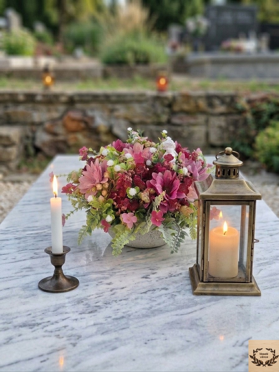 Květinová dekorace v betonové misce o průměru 18cm a výšce 6cm s dekorací 20cm průměr a 12cm výška. Dekorace je vsazena do aranžovací hmoty pro suché aranžování a je osazena zeleným kapradím, skalničkou, fialovou a bílou gypsophilou, růžovými bobulemi, drobnými růžovými kvítky v kombinaci růžovo-fialových květů chryzantém. Doplňkem dekorace je anděl vyrobený z polyresinu. Materiál látkový a umělý.
