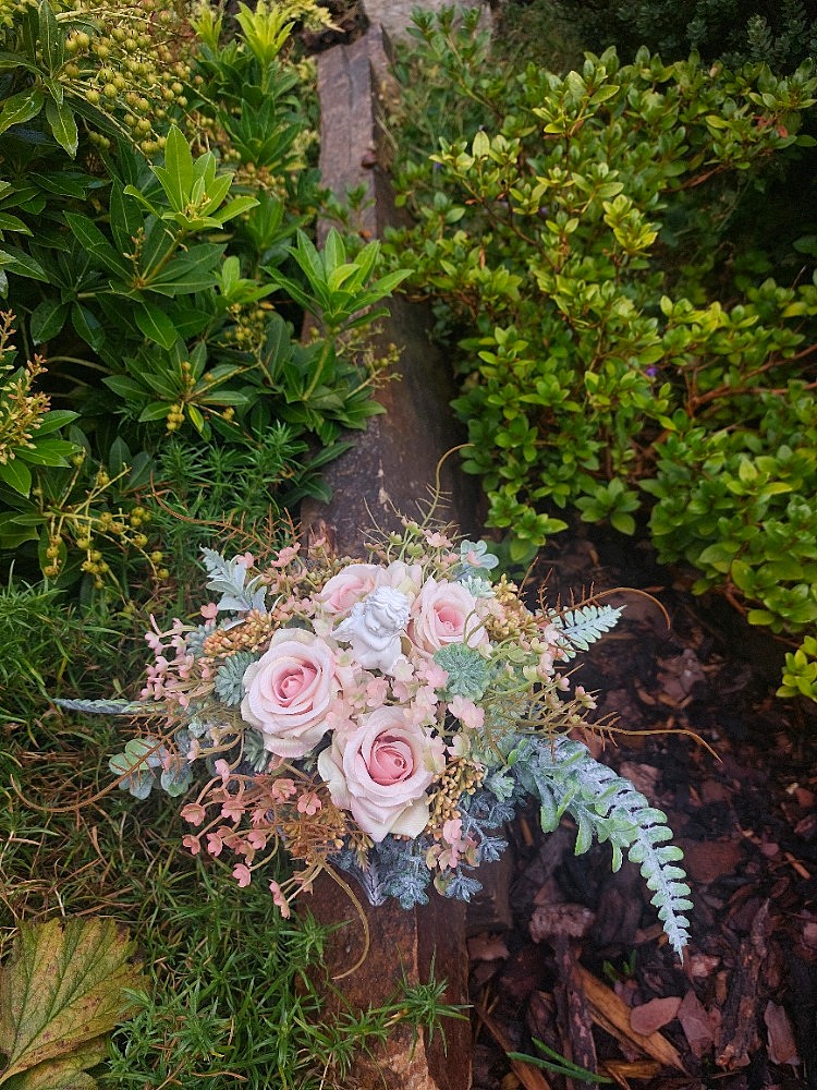 Květinová dekorace s andělem v obalu z umělého kamene ve tvaru srdce o rozměrech 15cmx15cm. Dekorace je vsazena do aranžovací hmoty pro suché aranžování a je osazena zelenou skalničkou, zelenými bodláky, hnědo-oranžovým kapradím, oranžovými bobulemi, drobnými oranžovými kvítky a květy zeleno-oranžových růží. Doplňkem dekorace je anděl vyrobený z polystonu. Materiál látkový a umělý.