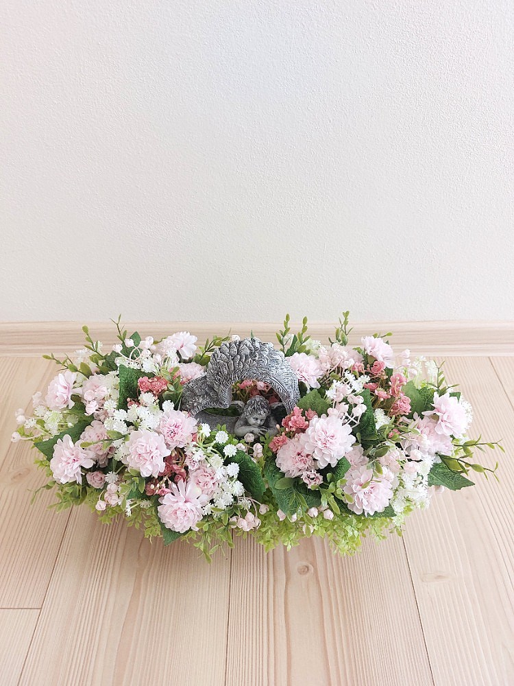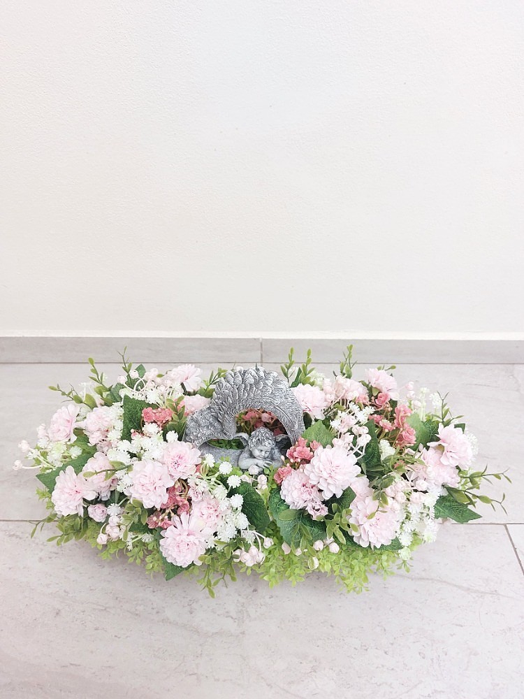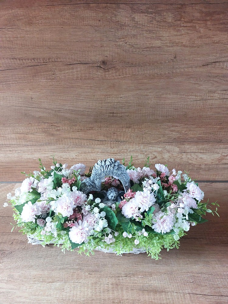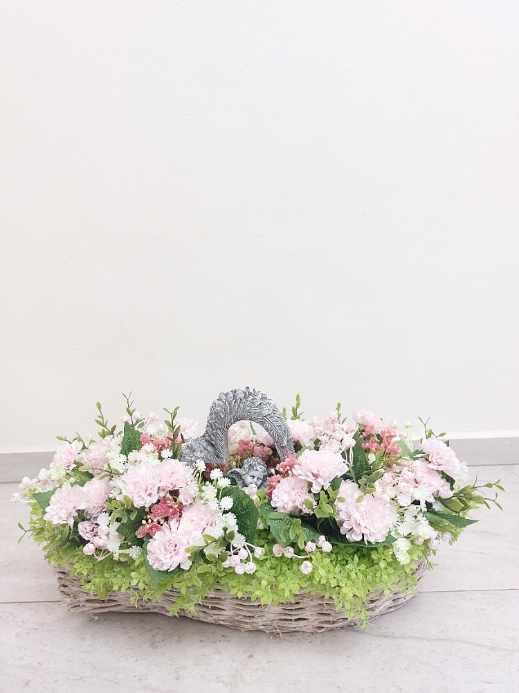 Květinová dekorace v šedo-bílé proutěné loďce o rozměrech 41cm délka, 13cm šířka a 8cm výška s dekorací 42cm délka, 20cm šířka a 20cm výška. Dekorace je vsazena do aranžovací hmoty pro suché aranžování a je osazena drobnými zelenými lístky, bílou a světle růžovou gypsophilou v kombinaci květů světle růžových santinek a drobných růžových kytiček. Doplňkem dekorace je anděl v srdci vyrobený z polyresinu. Materiál látkový a umělý.