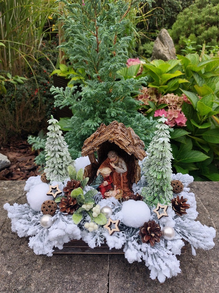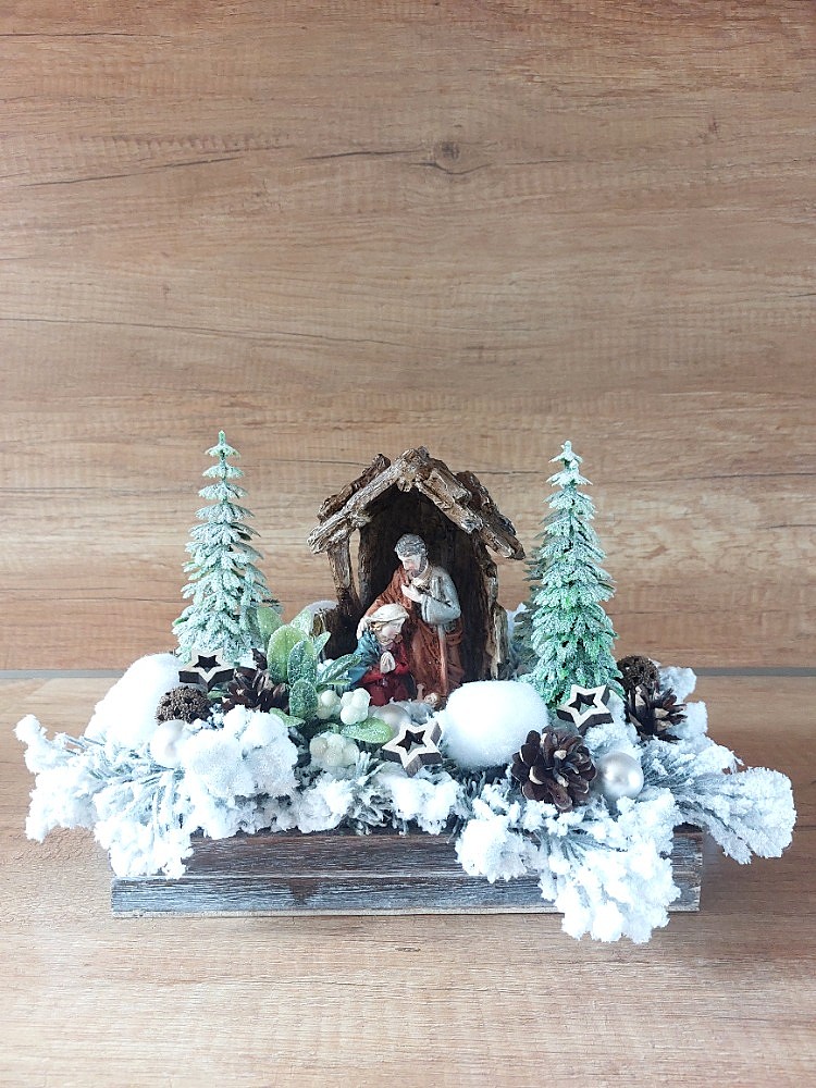 Vánoční dekorace na dřevěném tácu vzhledu vintage(ošoupaný vzhled) o rozměrech 25cmx15cmx3cm. Dekorace je vsazena do aranžovací hmoty pro suché aranžování a je osazena ojíněným jehličím, jmelím, stromečky, přírodními šiškami, sušenými plody sweetgumu, dřevěnými hvězdičkami, sněhovými koulemi a bílými plastovými kuličkami. Doplňkem dekorace je betlém vyrobený z polyresinu. Materiál umělý a přírodní.