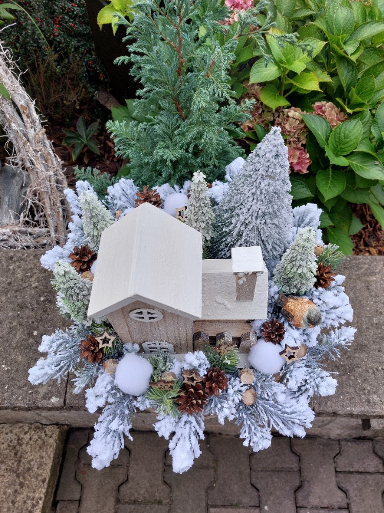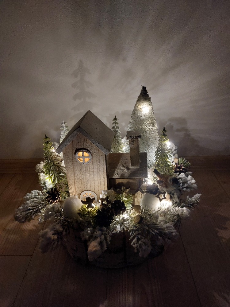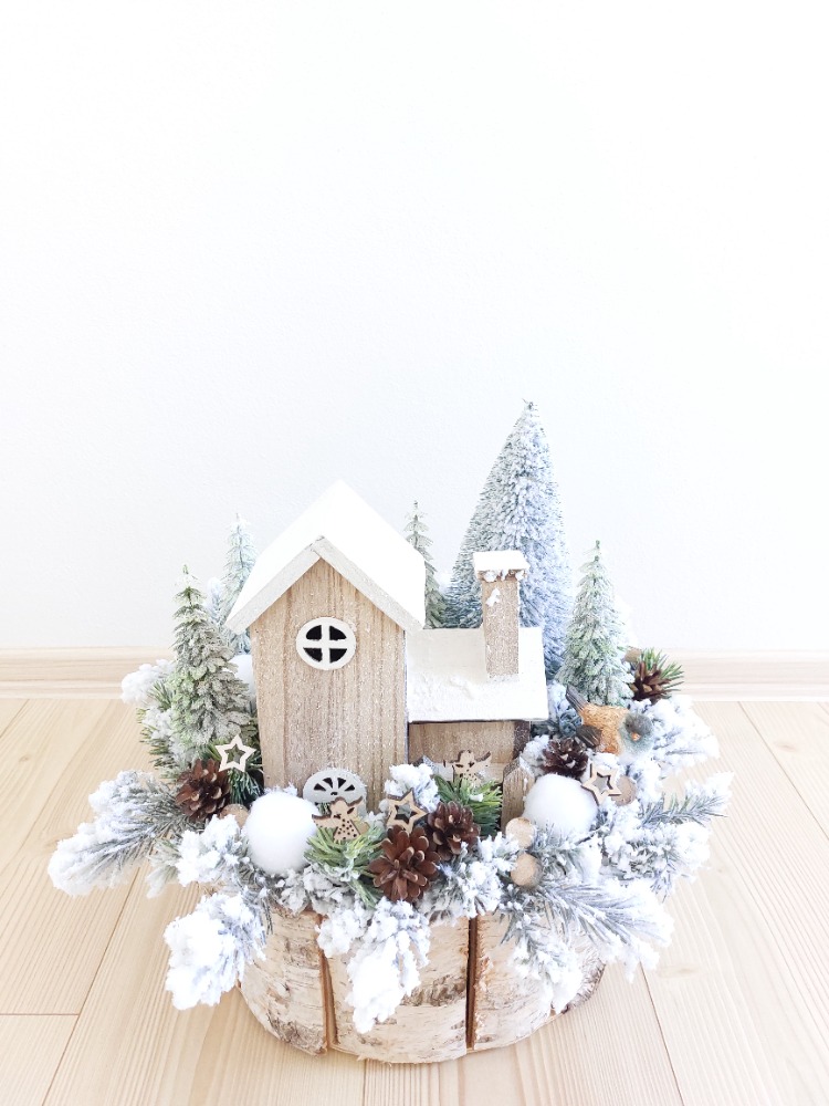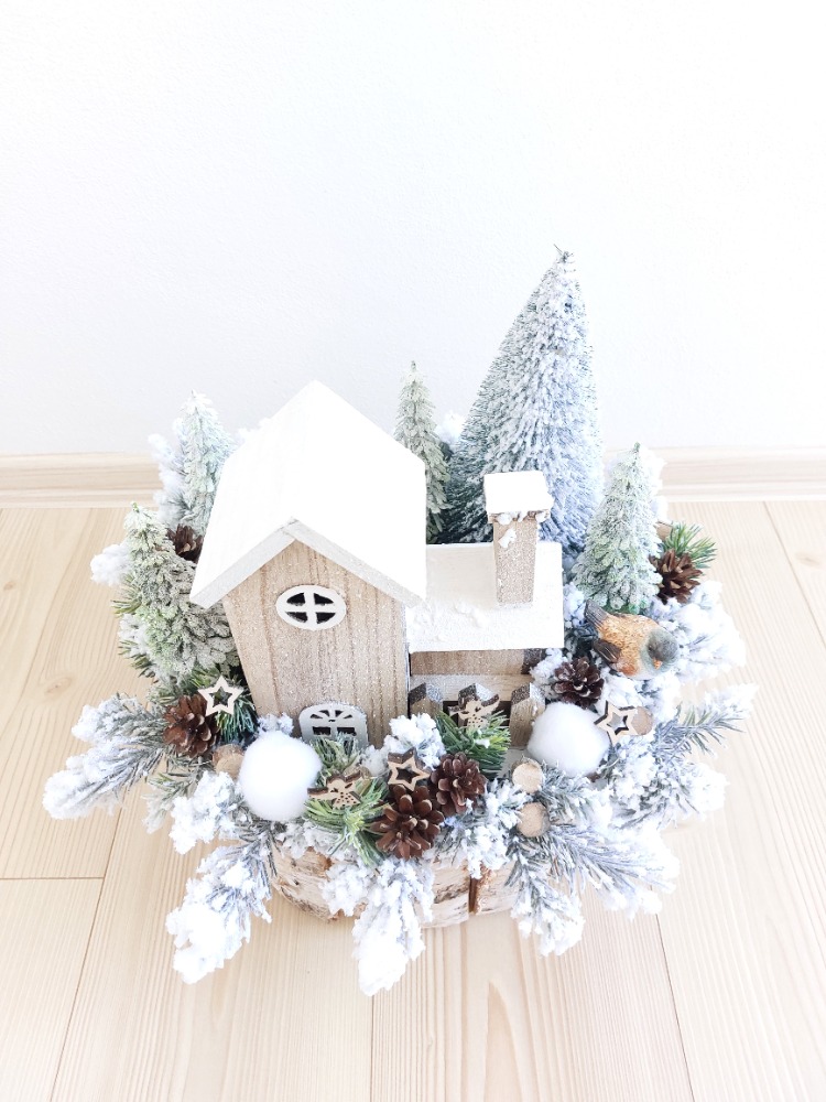 Vánoční dekorace v kulatém březovém obalu o průměru 35cm a výšce 12,5cm s dekorací 35cmx35cm. Dekorace je vsazena do aranžovací hmoty pro suché aranžování a je osazena ojíněným jehličím, umělými stromy, přírodními šiškami, kolečky, dřevěnými hvězdičkami, anděli a sněhovými koulemi. Doplňkem dekorace je osvícený dřevěný dům, ptáček vyrobený z polyresinu a led světýlka na tužkové baterie. Materiál umělý a přírodní.