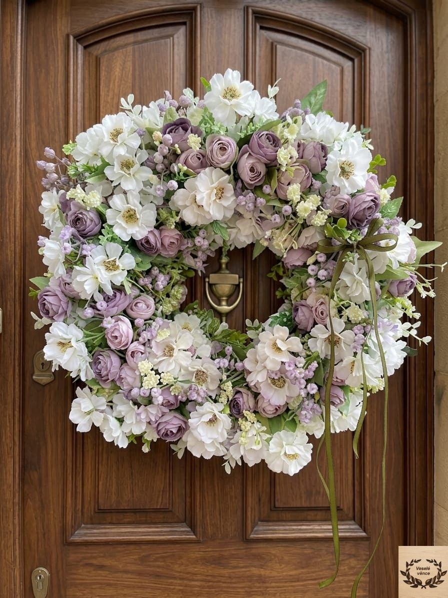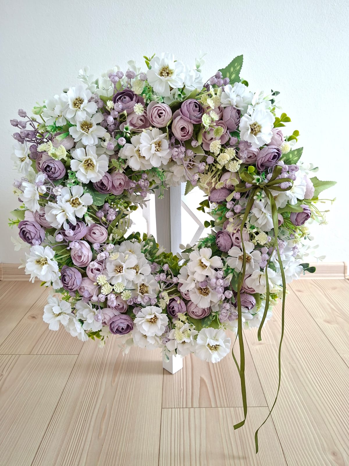 Ručně zdobený celoroční věnec na šedém proutěném korpusu o průměru 35cm s dekorací 40cm. Věnec je osazen zeleným a bílo-zeleným eukalyptusem, bílou a fialovou gypsophilou v kombinaci květů bílých clematisů a fialových ranunculusů. Doplňkem věnce je zelená látková mašle. Materiál látkový a umělý.