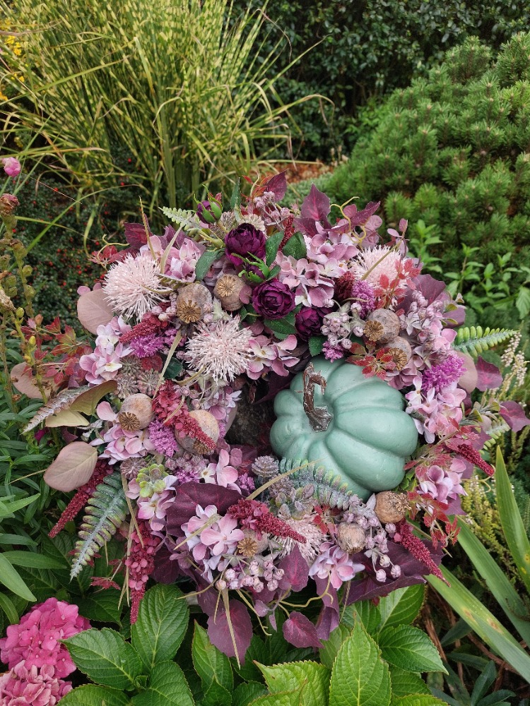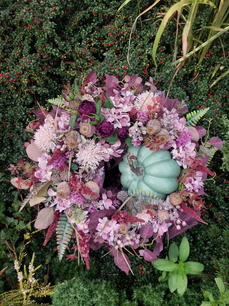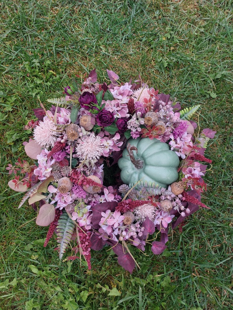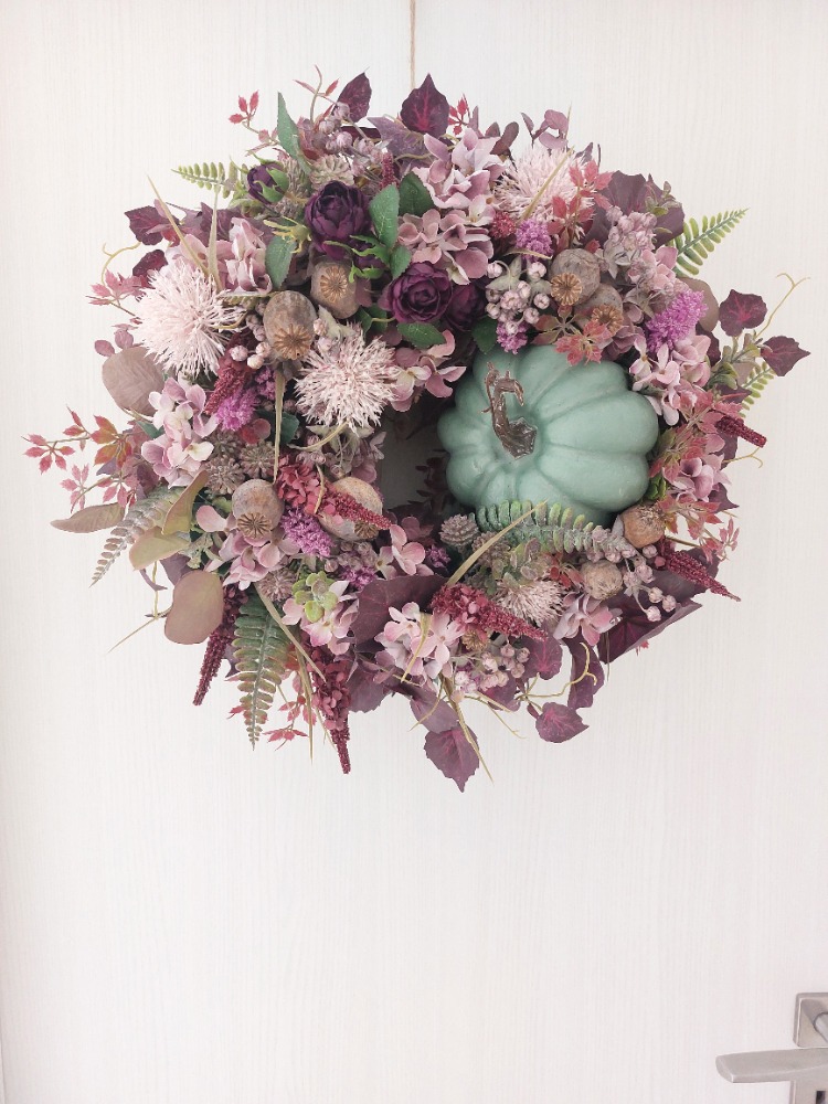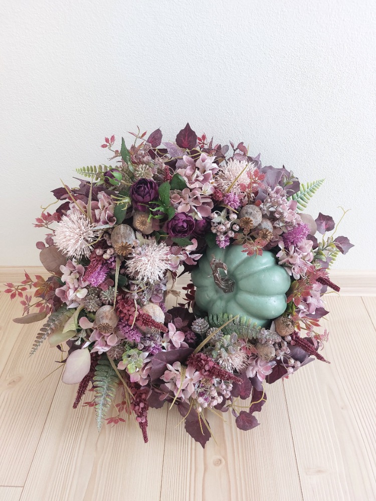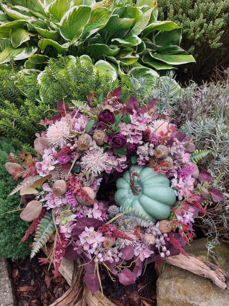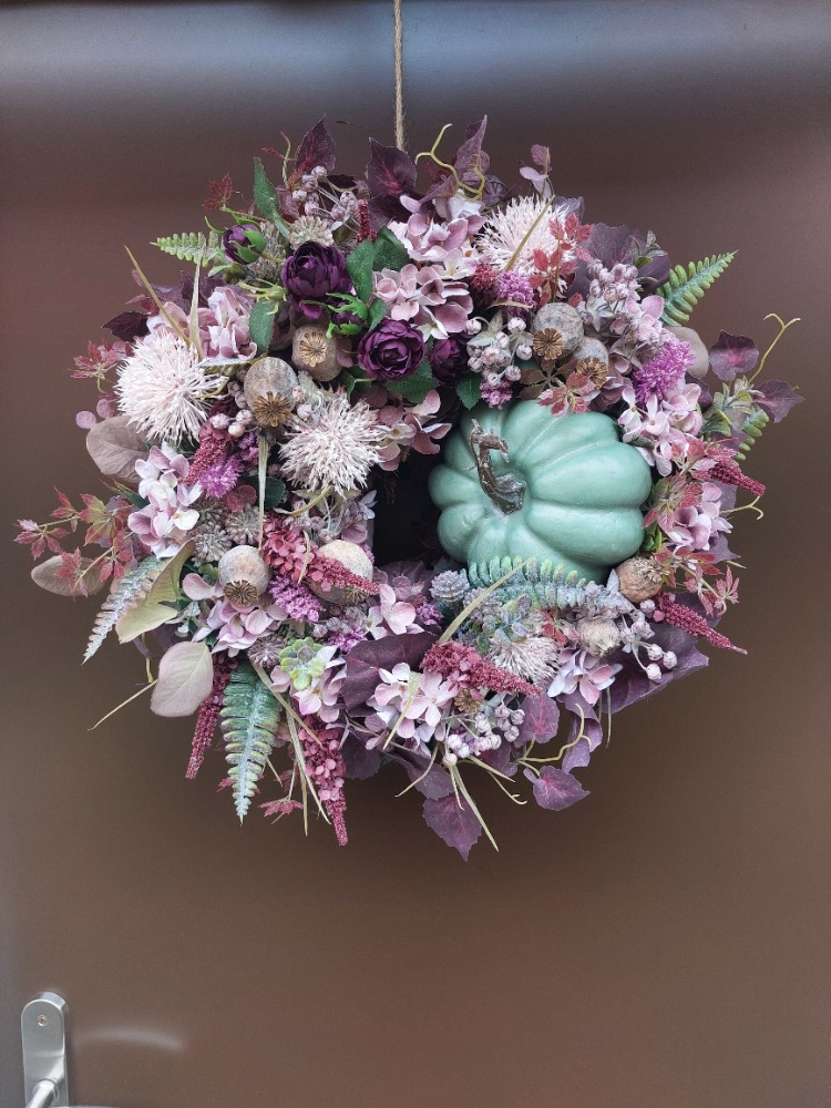 Podzimní ručně zdobený věnec na šedém proutěném korpusu o průměru 35cm s dekorací 38cm. Věnec je osazen zelenými listy, vínovými listy hroznového vína, zeleno-fialovým eukalyptusem, vínovými a fialovými bodláky, fialovým vřesem, vínovo-zelenými lístky, fialovou gypsophilou v kombinaci květů tmavě fialové keříčkové růže a fialové hortenzie. Doplňkem dekorace je zelená plastová dýně a přírodní makovice. Materiál látkový, přírodní a umělý.