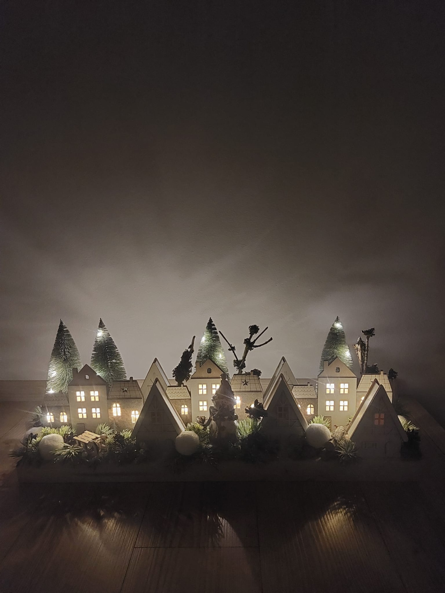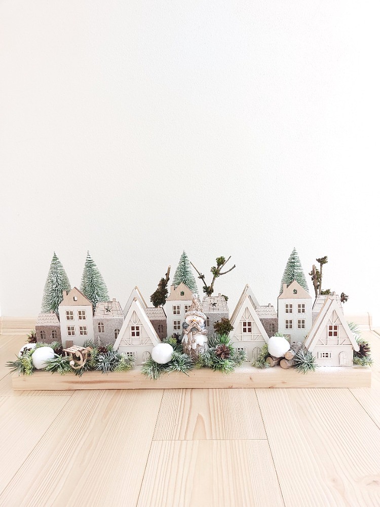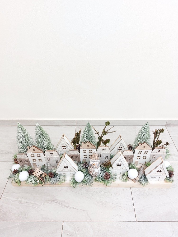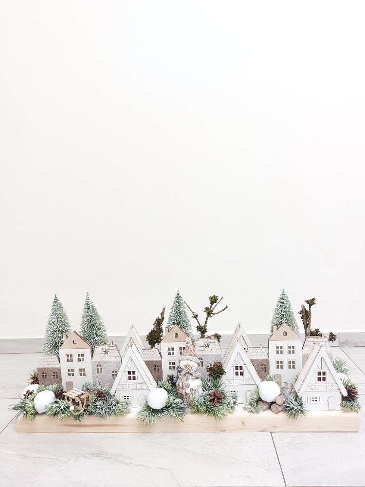 Zimní vesnička na masivním smrkovém dřevě o rozměrech 77cm délka a 20cm šířka. Dekorace je osazena umělým ojíněným jehličím, umělými a přírodními stromy, svítícími dřevěnými domečky v kombinaci s dekorací, které tvoří sněhové koule, dřevěné sáňky, přírodní šišky, klacíky a sněhulák vyrobený z polyresinu. Součástí dekorace jsou led světýlka na dvě tužkové baterie. Materiál umělý a přírodní.