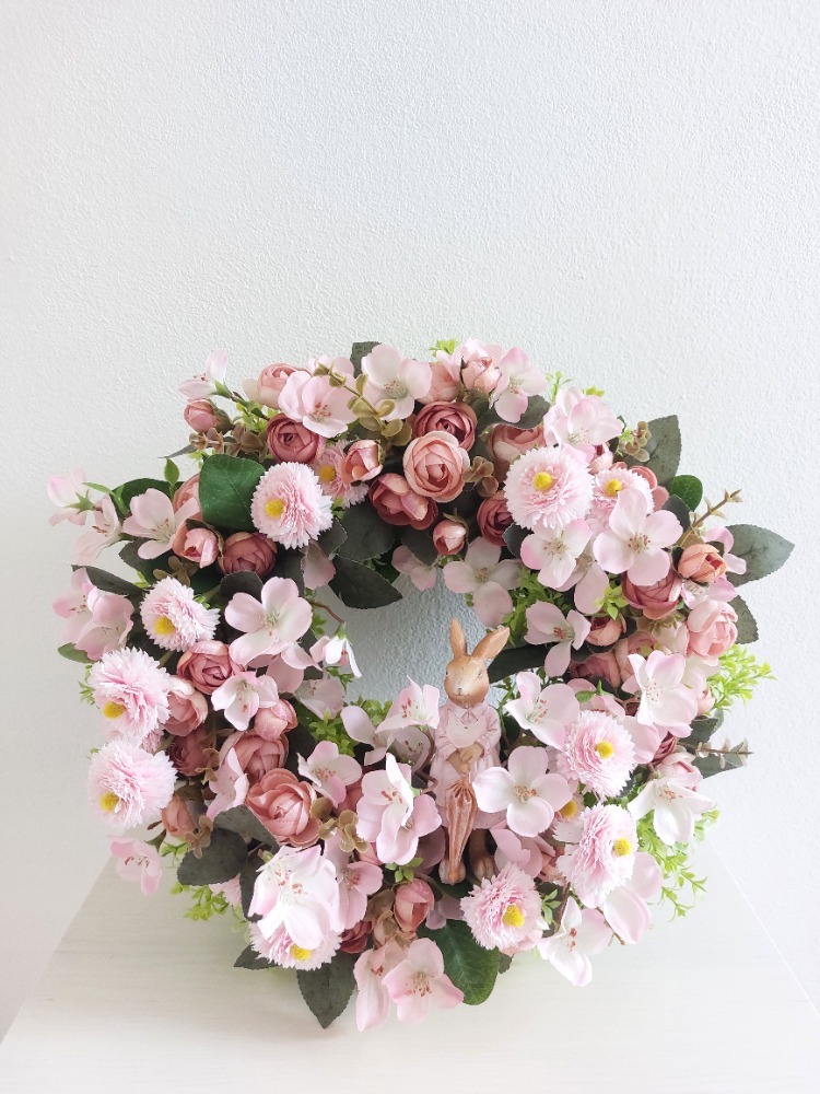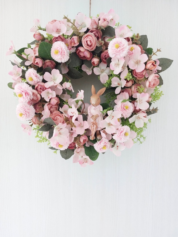 Bohatě ručně zdobený jarní věnec na šedém proutěném korpusu o průměru 30cm s dekorací 35cm. Věnec je osazen drobnými zelenými lístky v kombinaci květů starorůžových ranunculusů, růžových jabloňových květů a sedmikrásek. Doplňkem věnce je zaječice vyrobená z polyresinu. Materiál látkový a umělý.