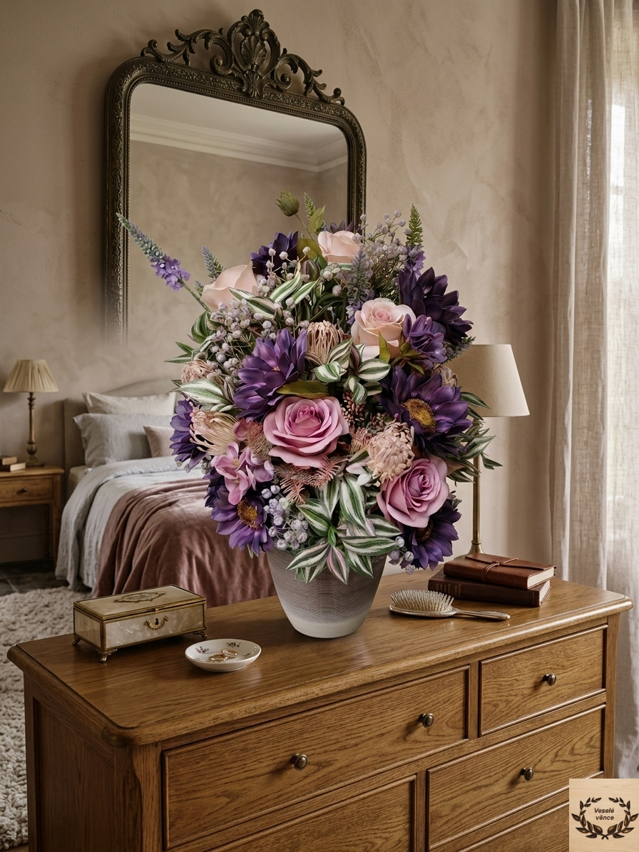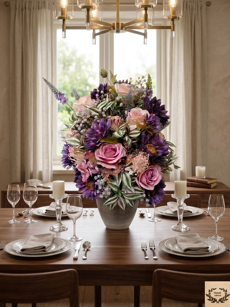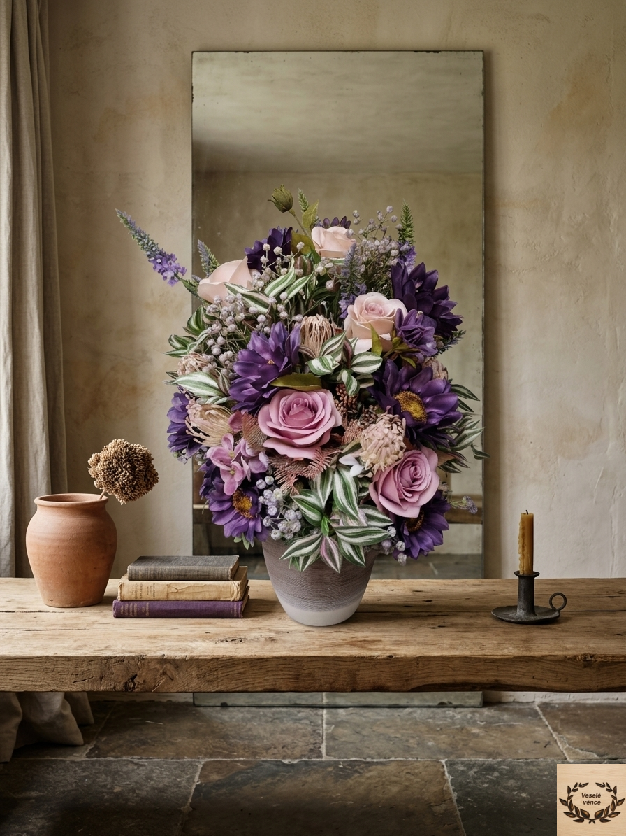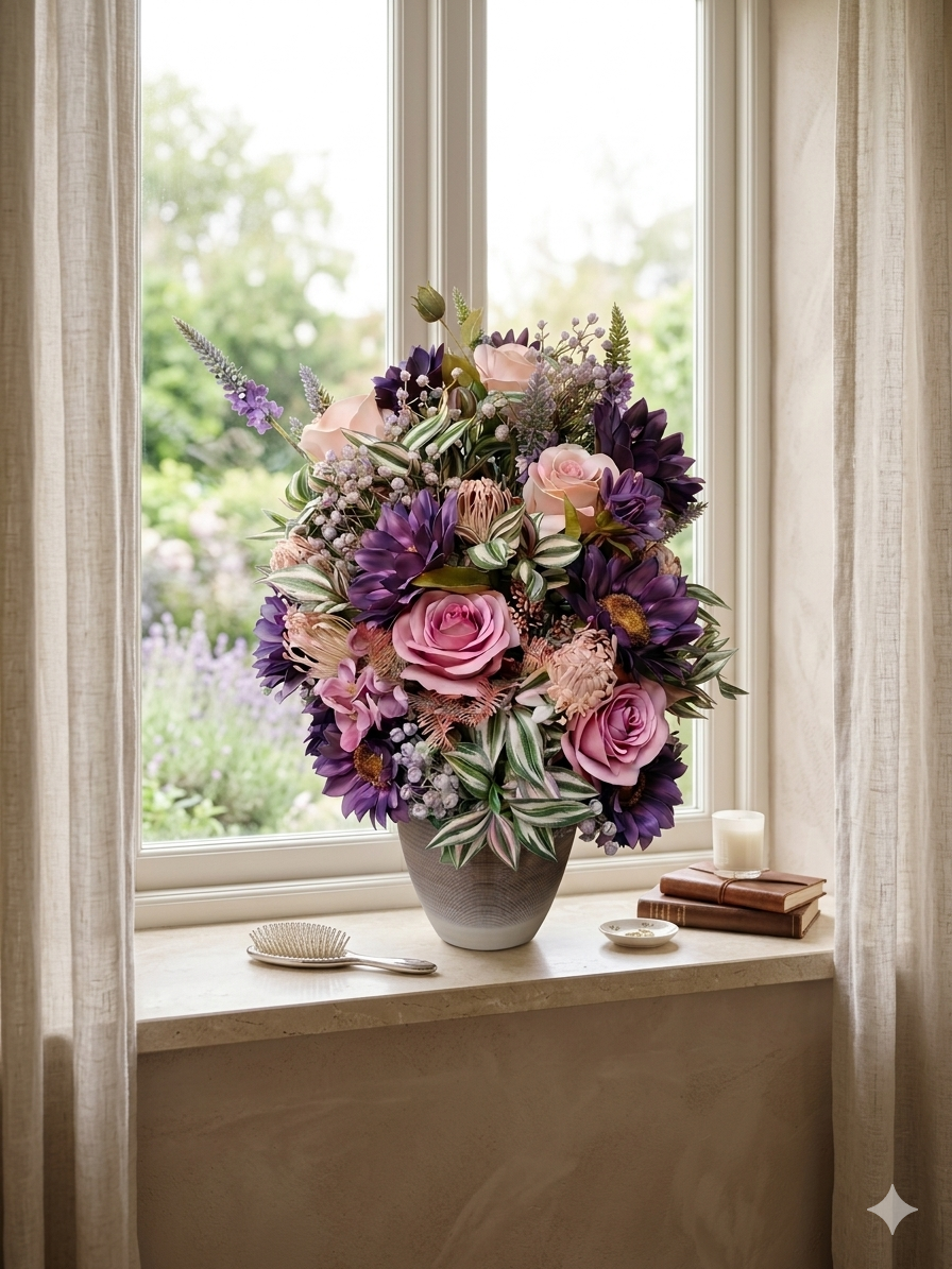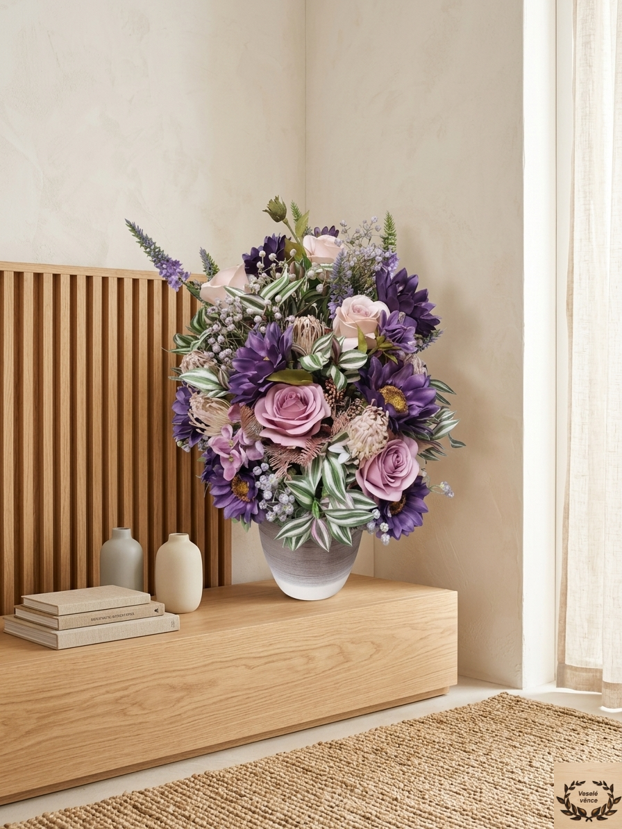 Květinová dekorace ve smetanovo-šedém keramickém obalu o rozměru s dekorací 50cm výška a 35cm šířka. Dekorace je vsazena do aranžovací hmoty pro suché aranžování a je osazena bílo-zelenými listy s jemně fialkovým nádechem, zelenými lístky, fialovo-zelenou gypsophilou, fialovým rdestem, světle-fialovými bodláky v kombinaci tmavě fialových květů slunečnic a světle a tmavě fialovými růžemi. Materiál látkový a umělý.