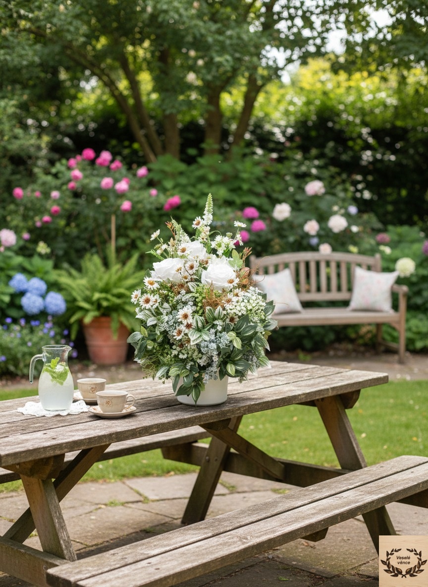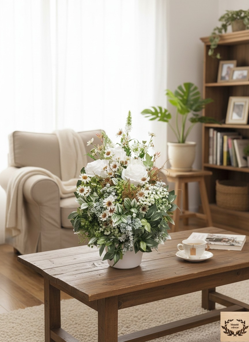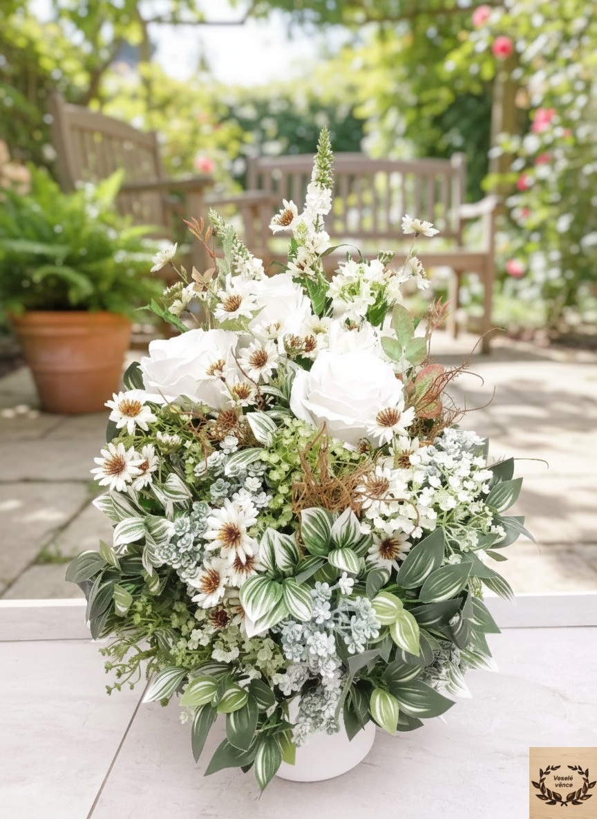 Květinová dekorace v bílém keramickém obalu o rozměru 60cm výška a 35cm šířka. Dekorace je vsazena do aranžovací hmoty pro suché aranžování a je osazena zeleno-bílými listy, bílo-zelenou skalničkou, zeleno-hnědým kapradím, drobnými zeleno-bílými lístky, bílým rdestem, agapantusem v kombinaci květů bílých růží a čekanky. Materiál látkový a umělý.