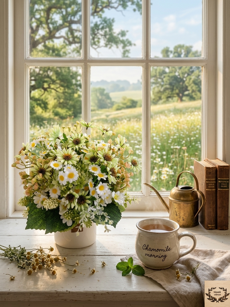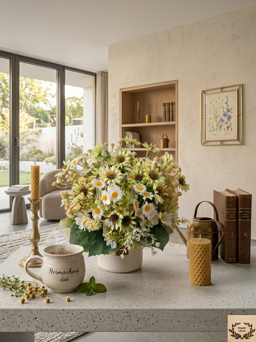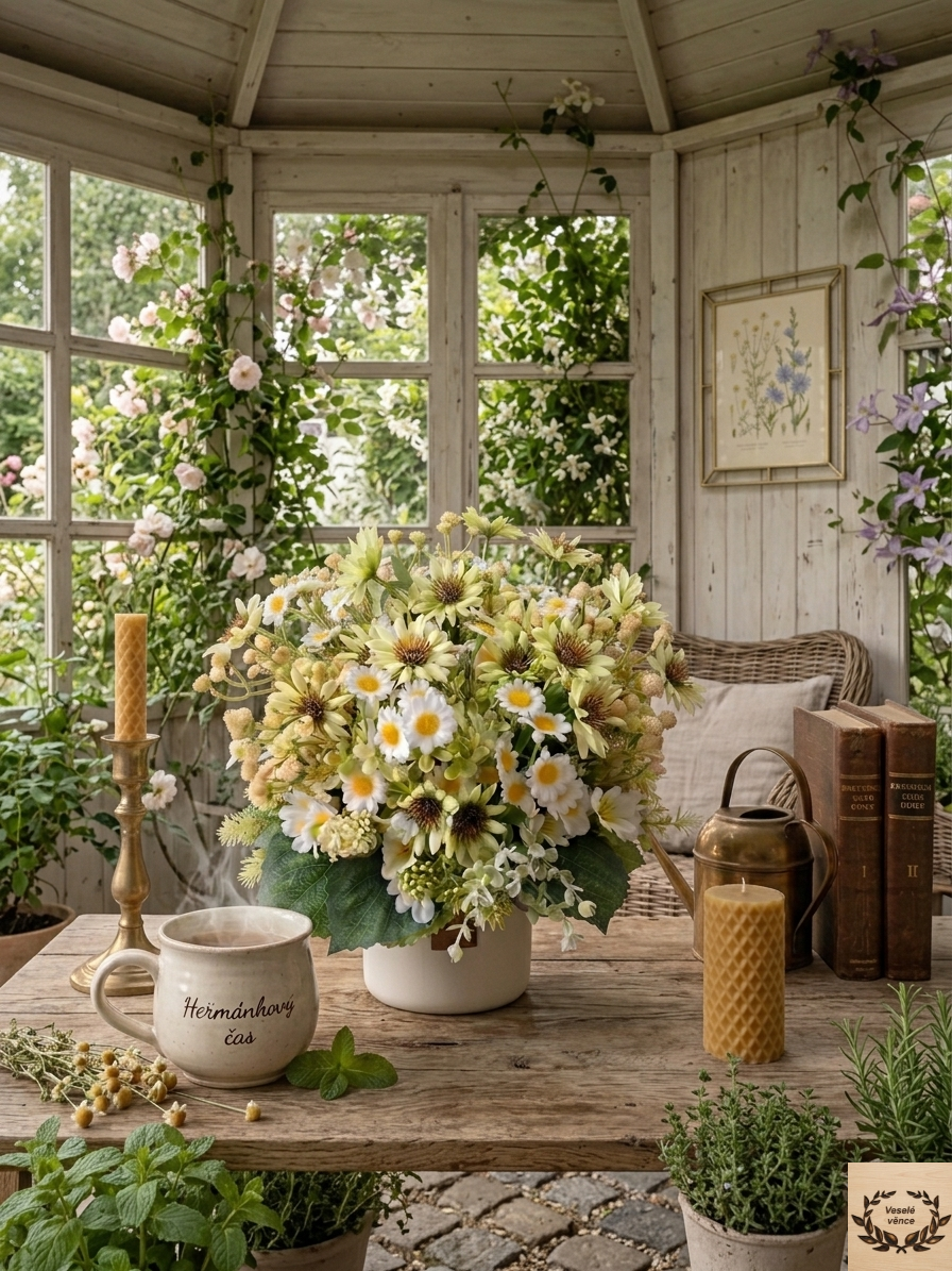 Květinová dekorace v bílém keramickém obalu s oušky o průměru 12cm a 8cm výška s dekorací 20cm šířka a 20cm výška. Dekorace je vsazena do aranžovací hmoty pro suché aranžování a je osazena drobnými zeleno-bílými lístky, bílo-zelenými kvítky, heřmánkem, zelenou čekankou a řůžovo-zelenou gypsophilou. Materiál látkový a umělý.