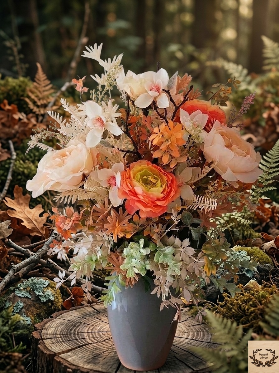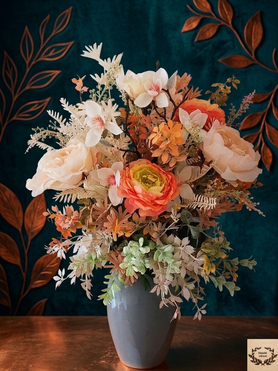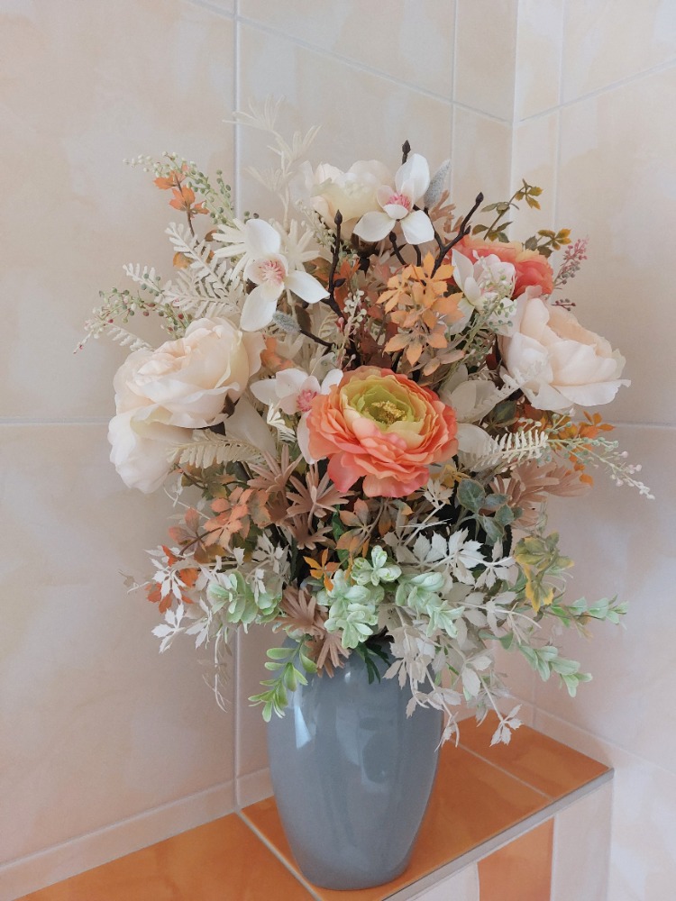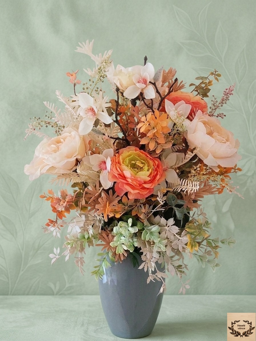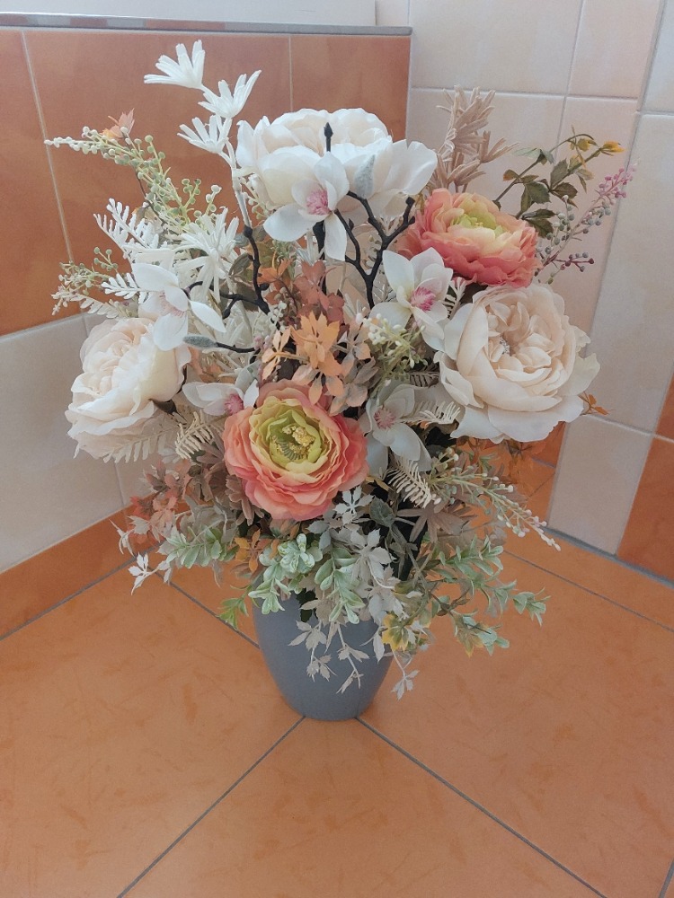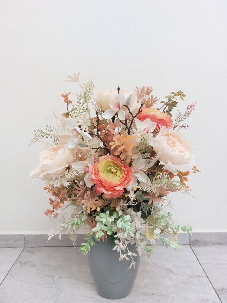 Květinová dekorace v šedé keramické váze o rozměru 20cm výška a 15cm šířka s dekorací 55cm výška a 35cm šířka. Dekorace je vsazena do aranžovací hmoty pro suché aranžování a je osazena smetanovými květy růží, oranžovými květy pryskyřníku, větví magnolie, smetanovým kapradím, lístky, oranžovo-zelenou a hnědo-smetanovou přízdobou a světle zeleným eukalyptusem. Materiál látkový a umělý.