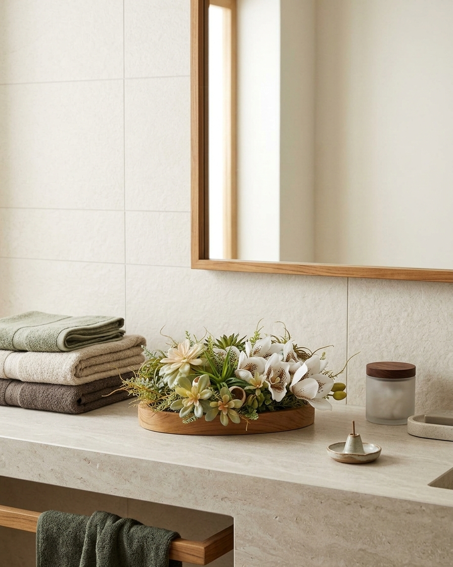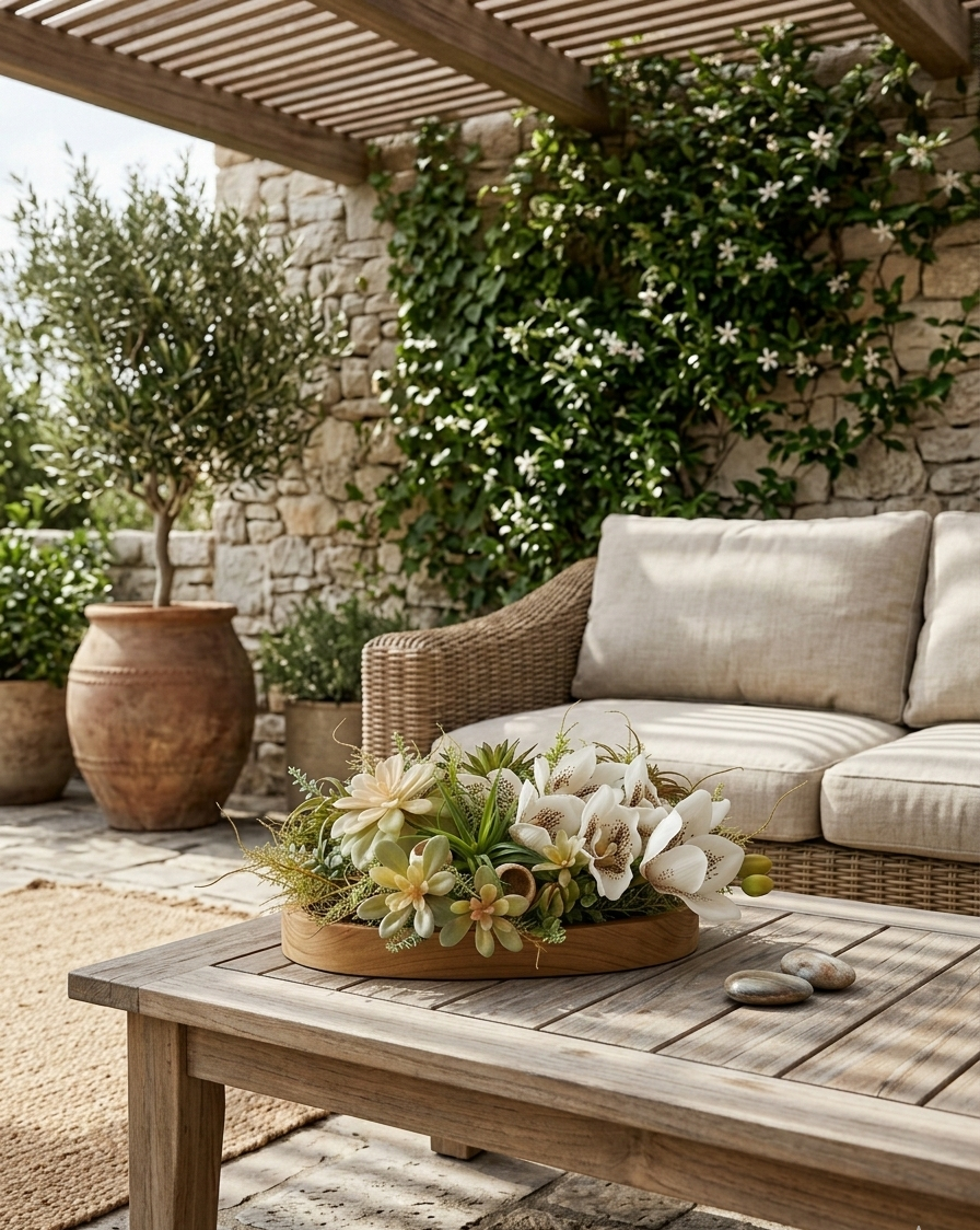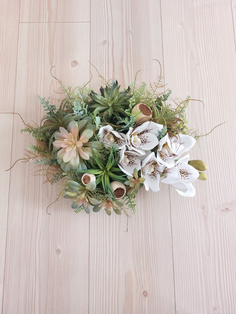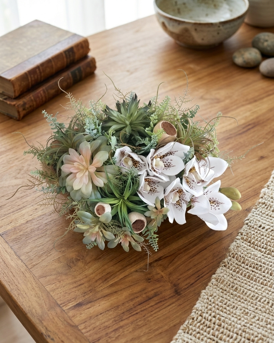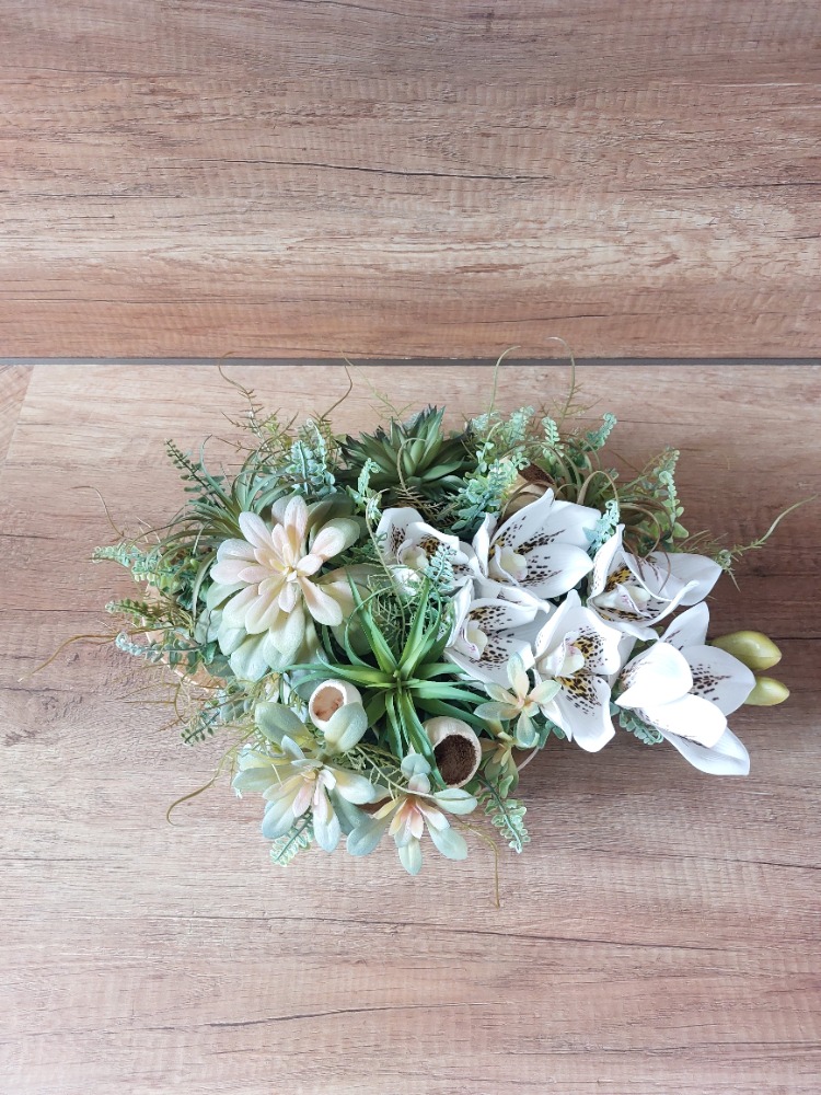 Květinová dekorace na teakovém tácu o rozměrech s dekorací 35cm délka a 25cm šířka je osazena zeleným kapradím a mixem sukulentů v kombinaci s květem bílo-hnědé orchideje doplněné přírodními Bell Cup plody. Materiál umělý a látkový.