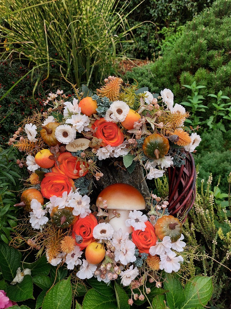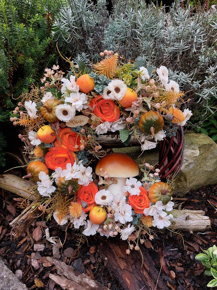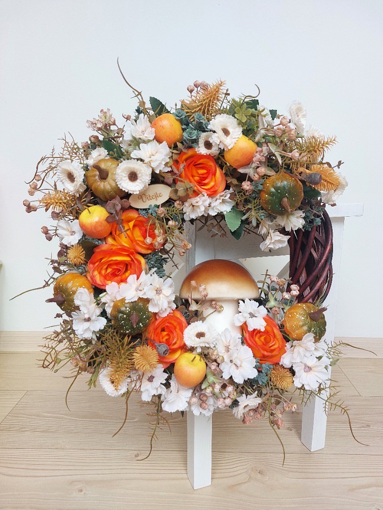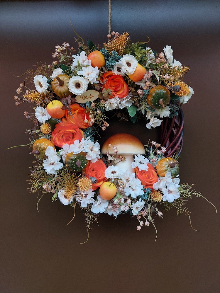 Podzimní ručně zdobený věnec na tmavě hnědém proutěném korpusu o průměru 30cm s dekorací 35cm. Věnec je osazen hnědým eukalyptusem, zeleným rozchodníkem, hnědo-zeleným kapradím, oranžovými bodláky, hnědou gypsophilou v kombinaci květů oranžových růží, smetanových clematisů a slaměnek. Doplňkem věnce je hřib, dýně a jablíčka vyrobené z plastu a dřevěný oválek s nápisem Vítejte. Materiál látkový, dřevěný a umělý.