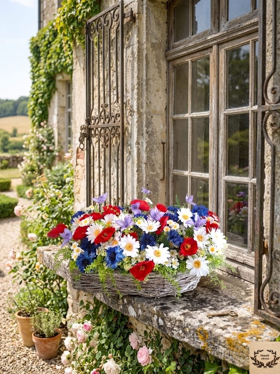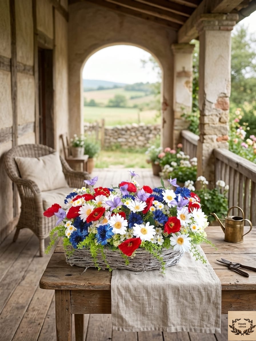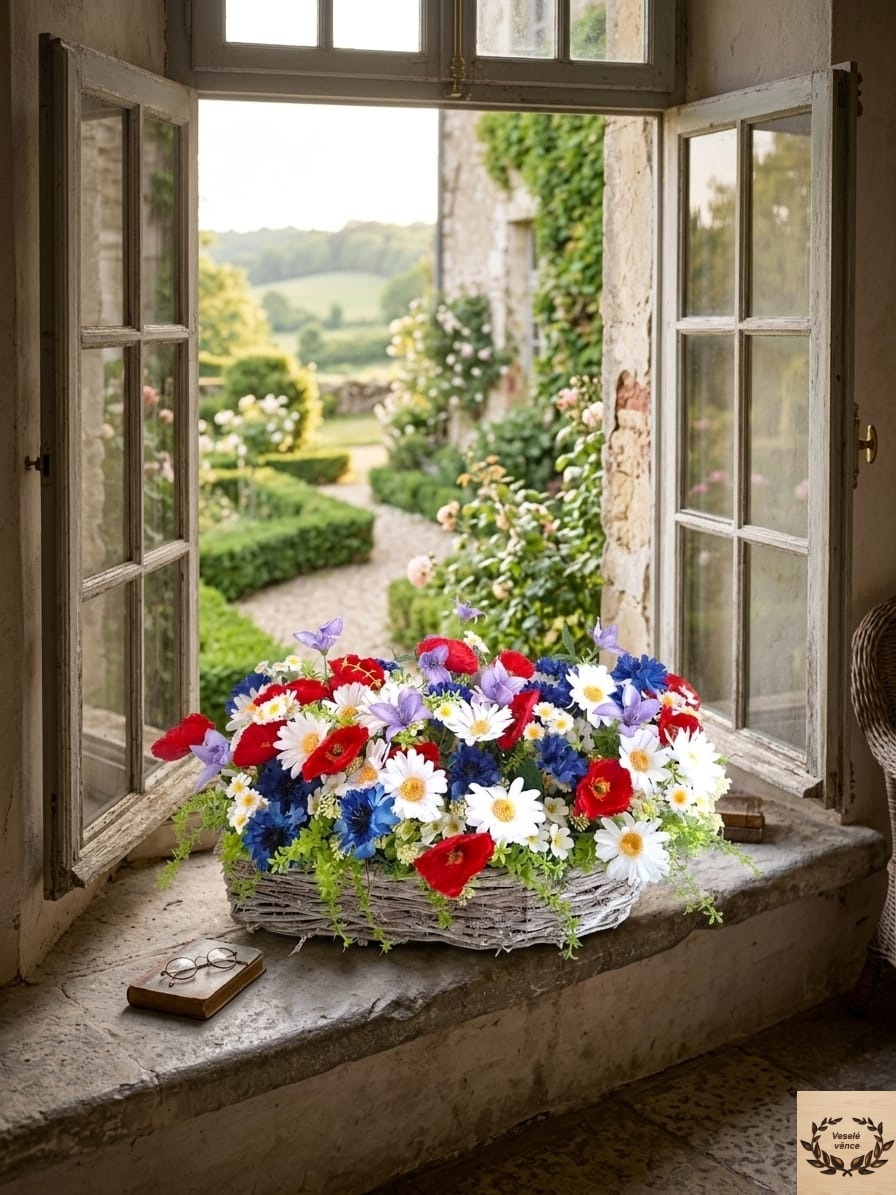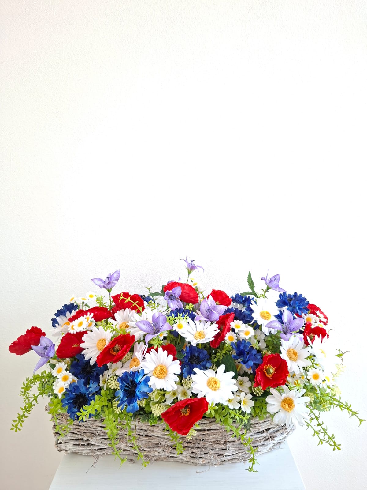 Květinová dekorace v proutěné slze z bělené révy o rozměrech 48cm délka, 17cm šířka a 11cm výška s dekorací 50cm délka, 25cm šířka a 25cm výška. Dekorace je vsazena do aranžovací hmoty pro suché aranžování a je osazena zelenou skalničkou, zeleným ptačincem, drobnými bílými kvítky v kombinaci lučních květů vlčího máku, kopretin, zvonků, chrpy a heřmánku. Materiál látkový a umělý.