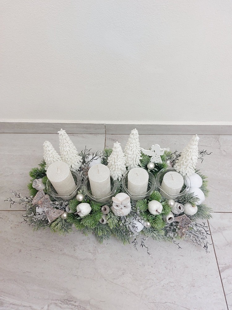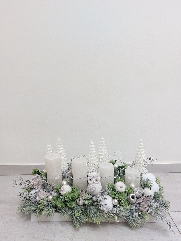 Základem adventní dekorace je dřevěný bílý tác o rozměrech 40x15cm. Dekorace je vsazena do aranžovací hmoty pro suché aranžování a je osazena ojíněným jedlovým jehličím, zelenou přízdobou, ledovými větvemi, umělými bílými stromy, sněhovými koulemi, přírodními doplňky, umělými bílými jablíčky, kuličkami, dřevěným andělem a sovou vyrobenou z terakoty. Skleněné zápichy, které slouží na vložení svíček jsou vyrobené českou sklářkou na ručně foukaném kahanu. Materiál umělý a přírodní.