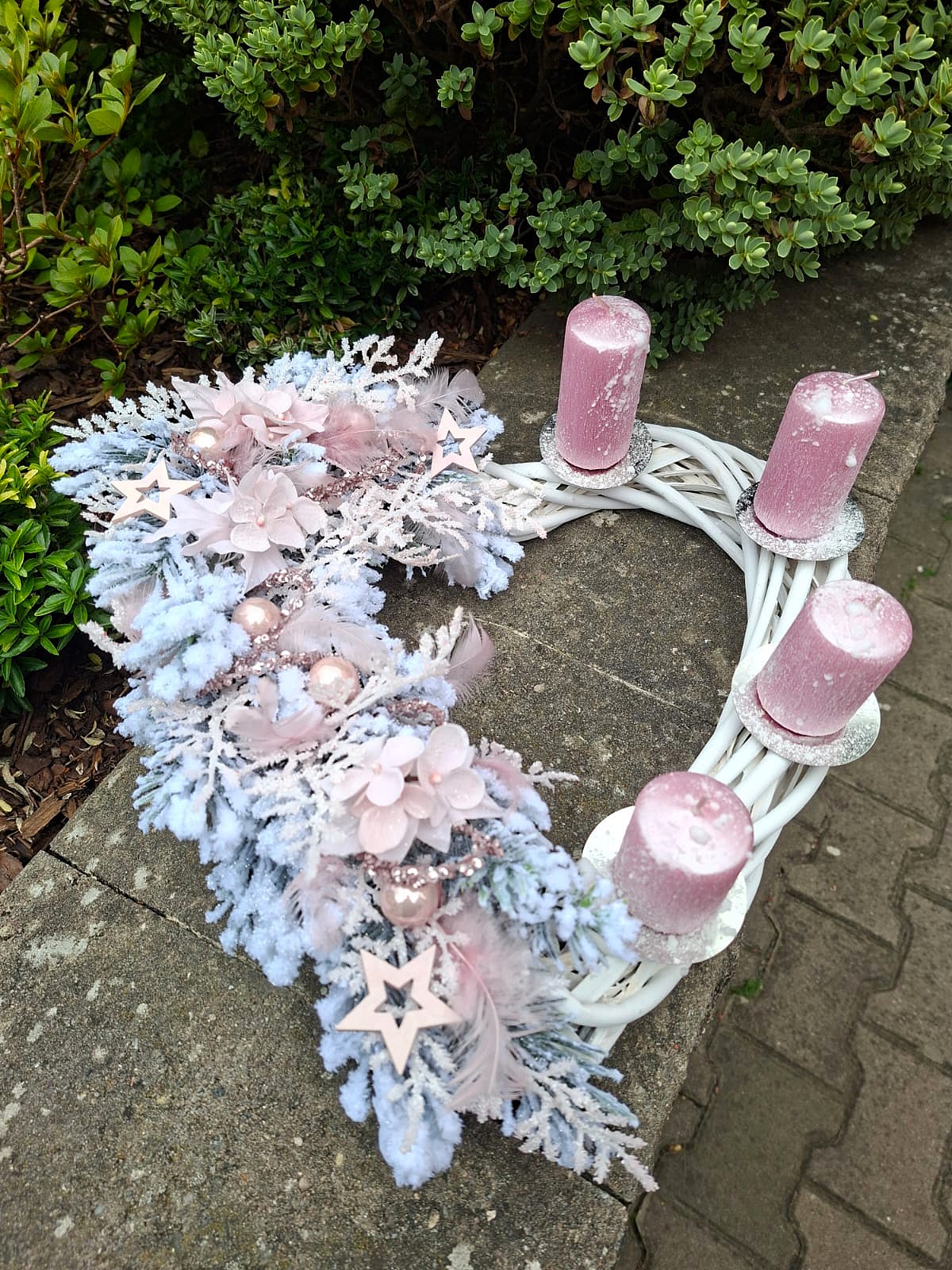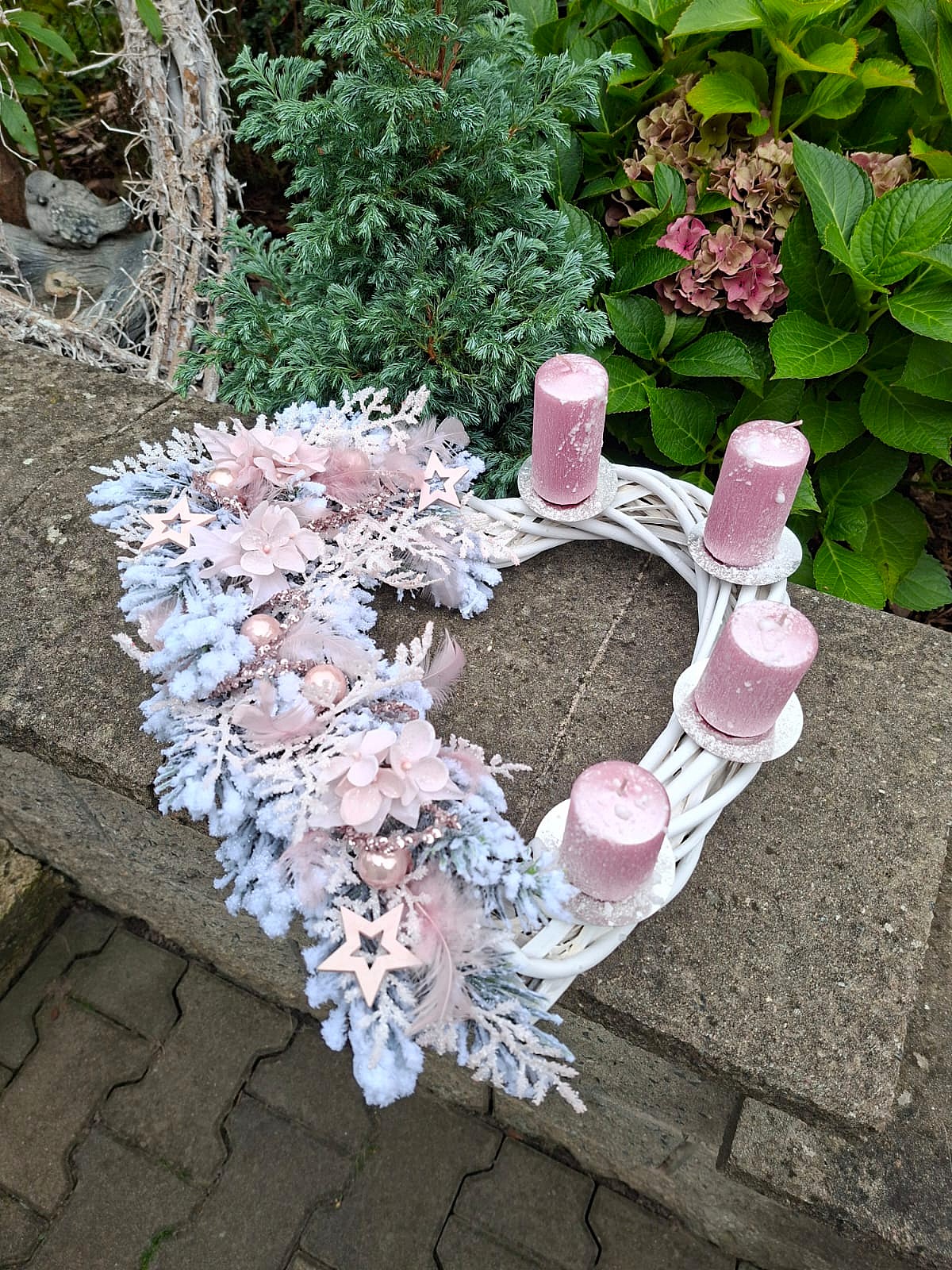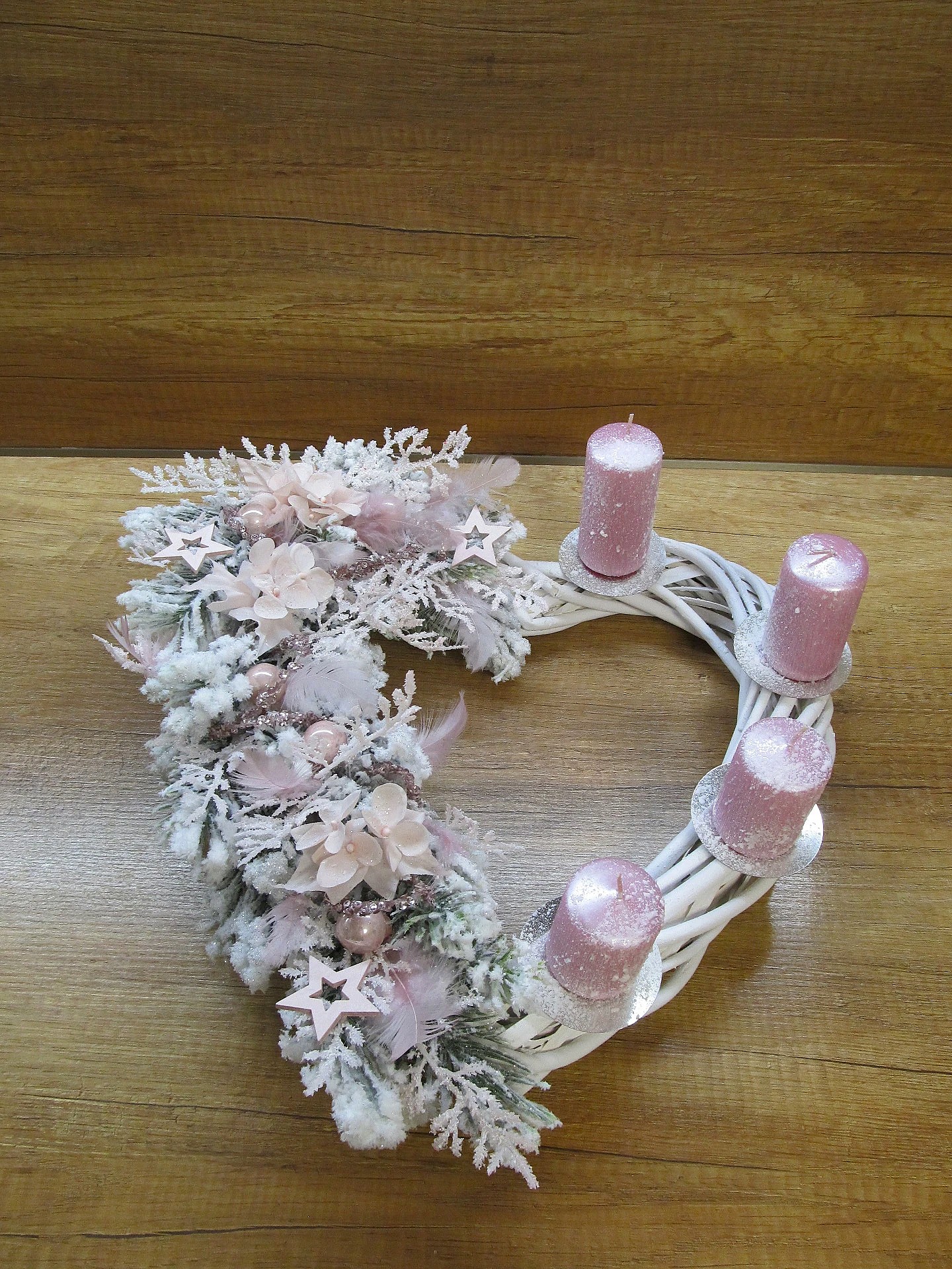 Růžové adventní srdce o rozměru proutěného korpusu 35x35cm je osazeno umělým zasněženým jehličím, růžovo-bílou přízdobou v kombinaci růžových květů, peříček, skleněných růžových kuliček, dřevěných hvězdiček a třpytivých kamínků na vlasci. Materiál látkový a umělý.