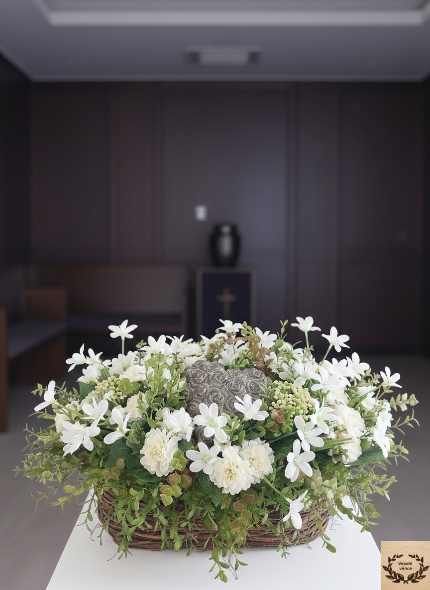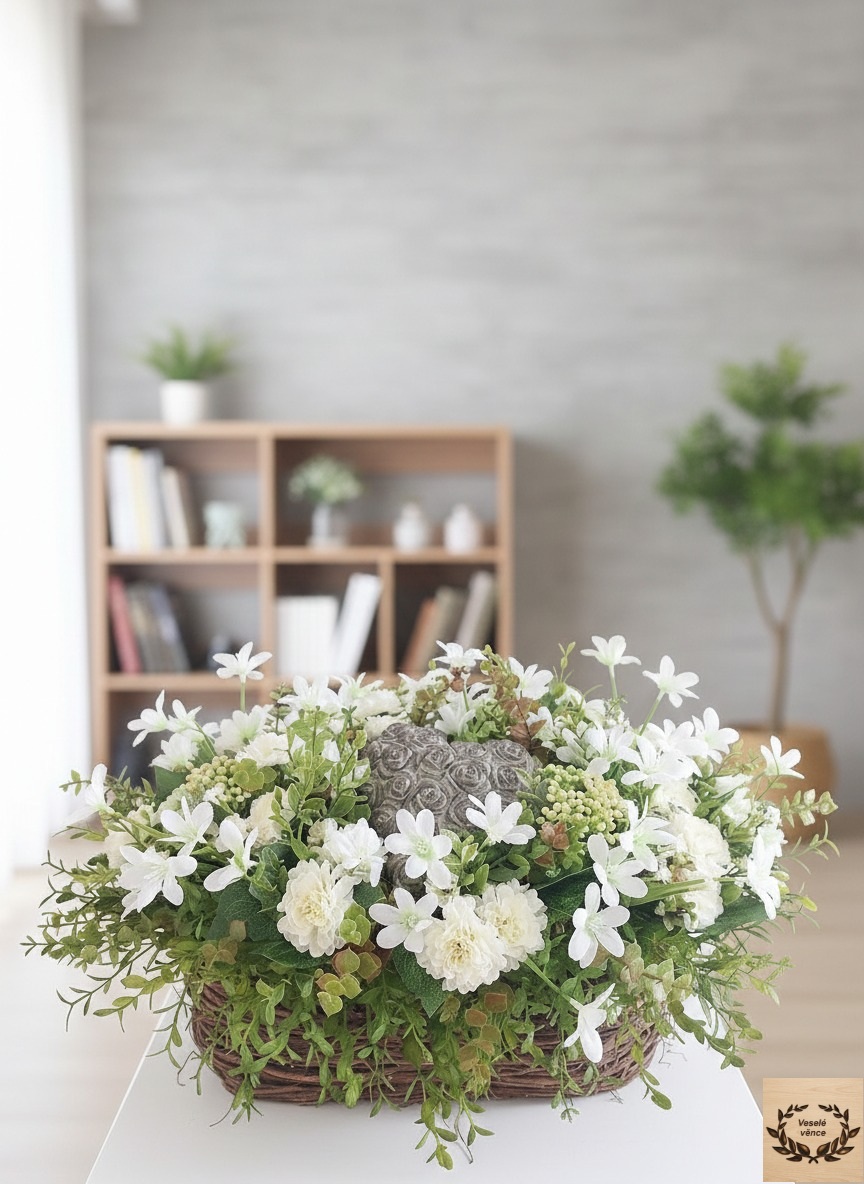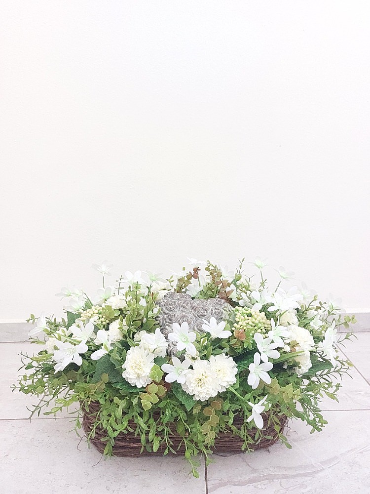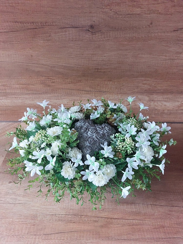 Květinová dekorace v hnědém proutěném truhlíku o rozměrech s dekorací 40cm délka, 30cm šířka a 20cm výška. Dekorace je vsazena do aranžovací hmoty pro suché aranžování a je osazena buxusem, zeleno-hnědým eukalyptusem, bobulemi v kombinaci drobných bílých kvítků a bílých santinek. Doplňkem dekorace je srdce vyrobené z polyresinu. Materiál umělý a látkový.