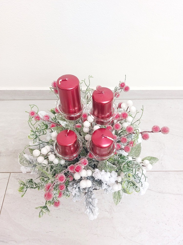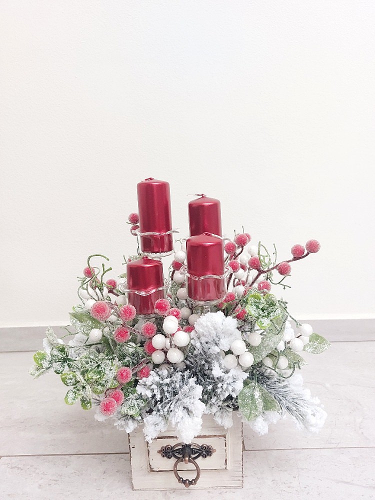 Adventní dřevěný šuplík o rozměrech s dekorací 22cm výška, 20cm šířka a 20cm délka. Dekorace je vsazena do aranžovací hmoty pro suché aranžování a je osazena ojíněným jedlovým jehličím, zelenou přízdobou, bílými a červenými bobulemi. Skleněné odstupňované zápichy jsou vyrobené českou sklářkou na ručně foukaném kahanu. Materiál umělý.