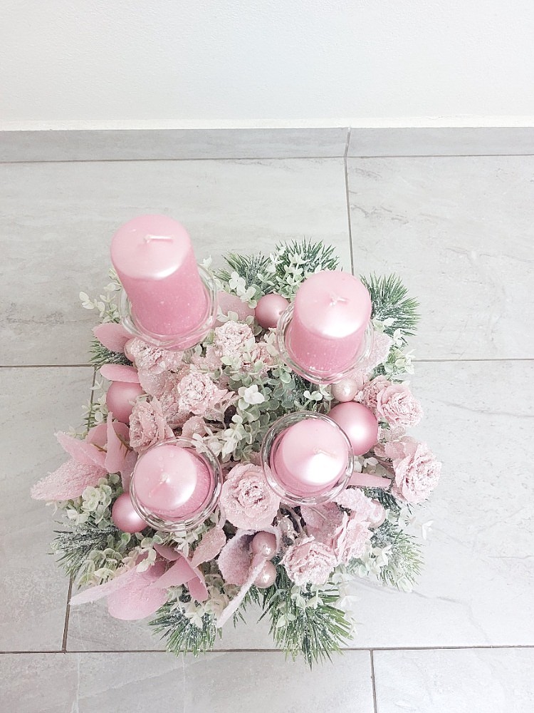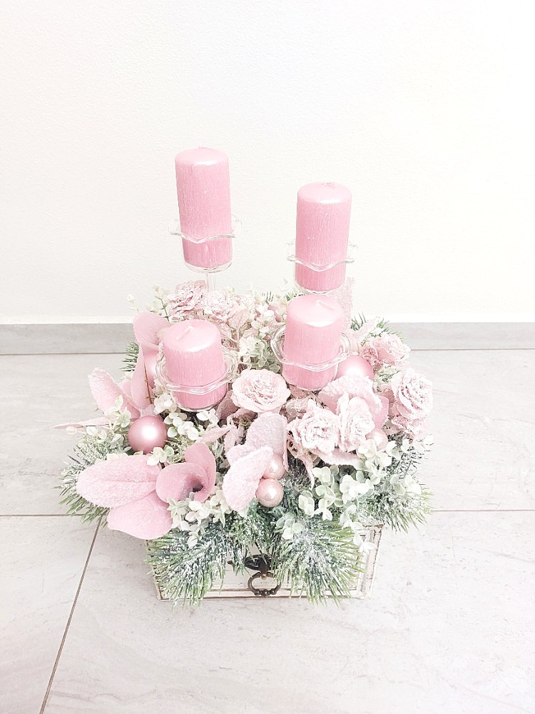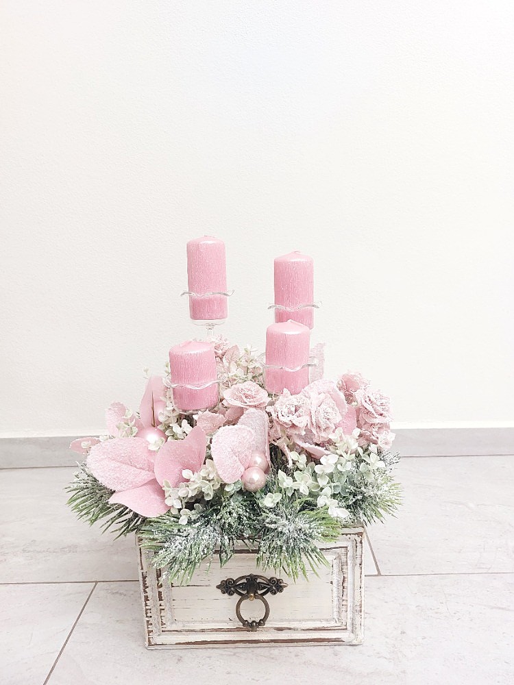 Dřevěný adventní šuplík o rozměrech s dekorací 24cm délka, 24cm šířka a 22cm výška. Dekorace je vsazena do aranžovací hmoty pro suché aranžování a je osazena ojíněným borovicovým jehličím, zeleno-bílými lístky, růžovým zasněženým eukalyptusem, květy ojíněných růžových růží a růžovými plastovými kuličkami. Skleněné odstupňované zápichy jsou vyrobené českou sklářkou na ručne foukaném kahanu. Mareriál umělý.