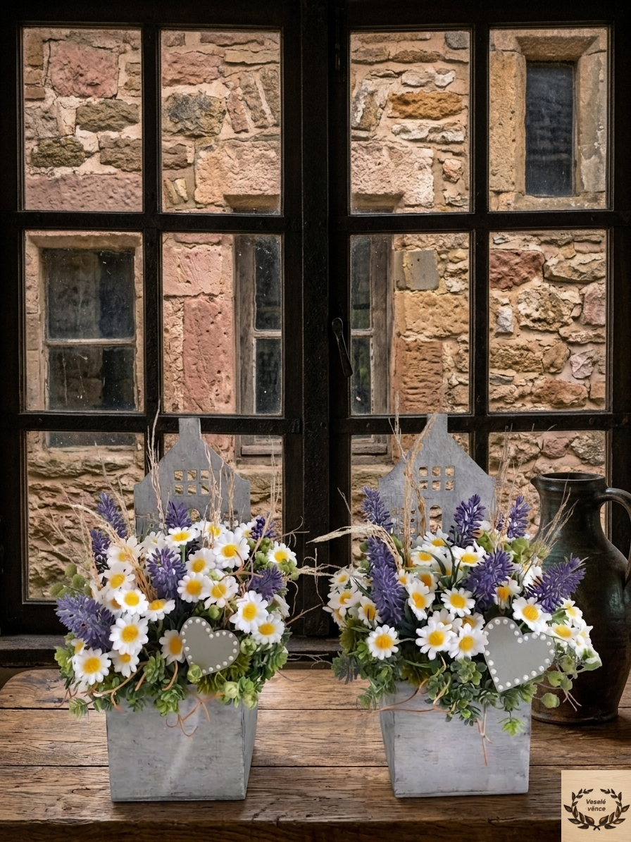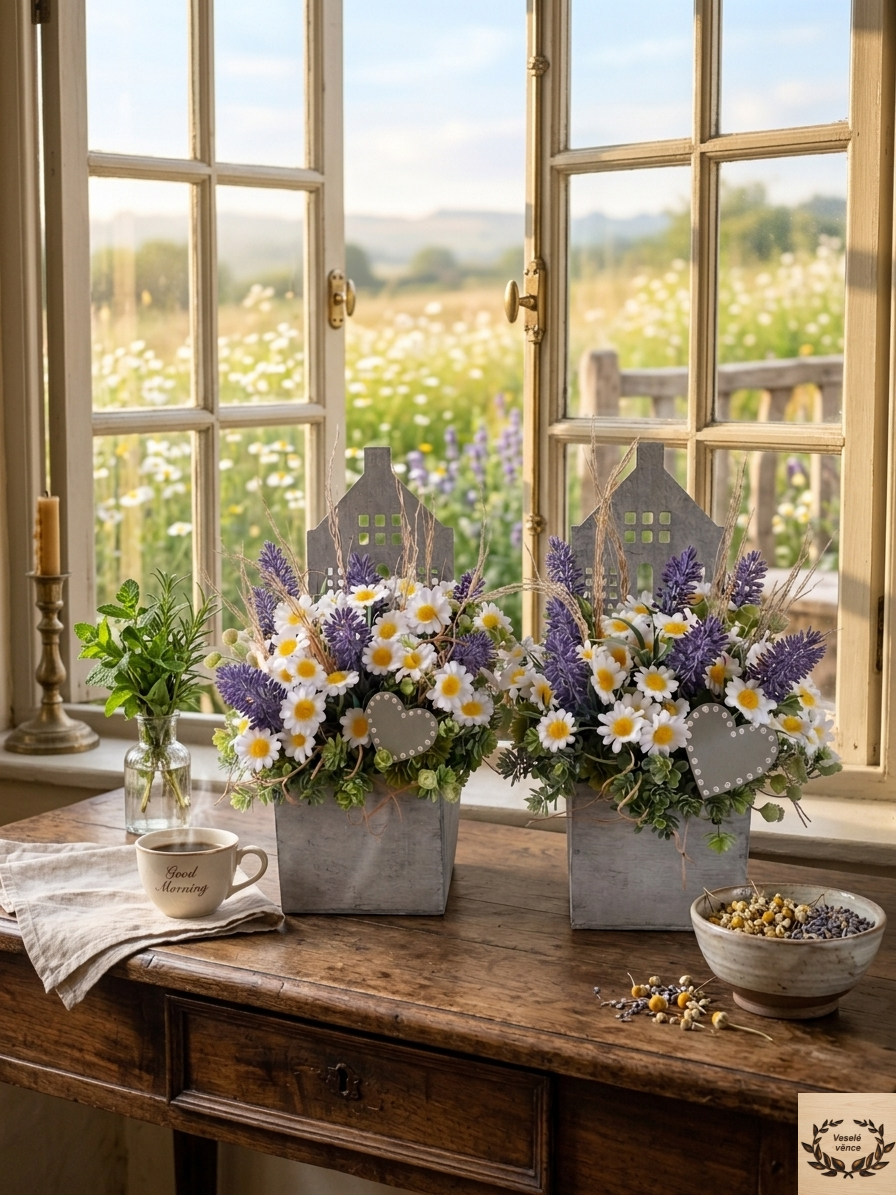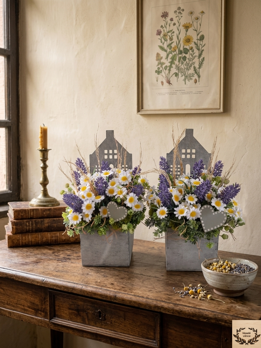 Květinová dekorace v šedém dřevěném domečku o rozměrech 9cm šířka, 9cm délka a 30cm výška. Dekorace je vsazena do aranžovací hmoty pro suché aranžování a je osazena zelenou skalničkou, květy heřmánku, levandule a oba domečky jsou doplněné sušinou. Doplňkem dekorace je dřevěné srdíčko. Materiál látkový, umělý a dřevěný.