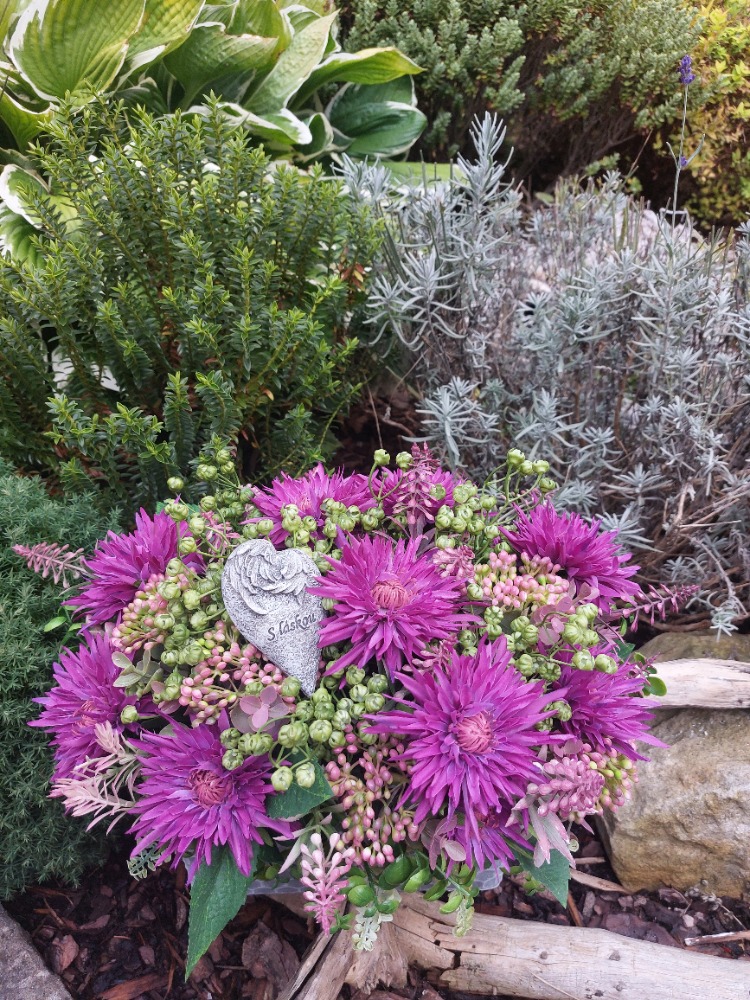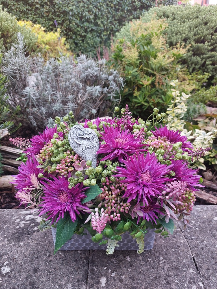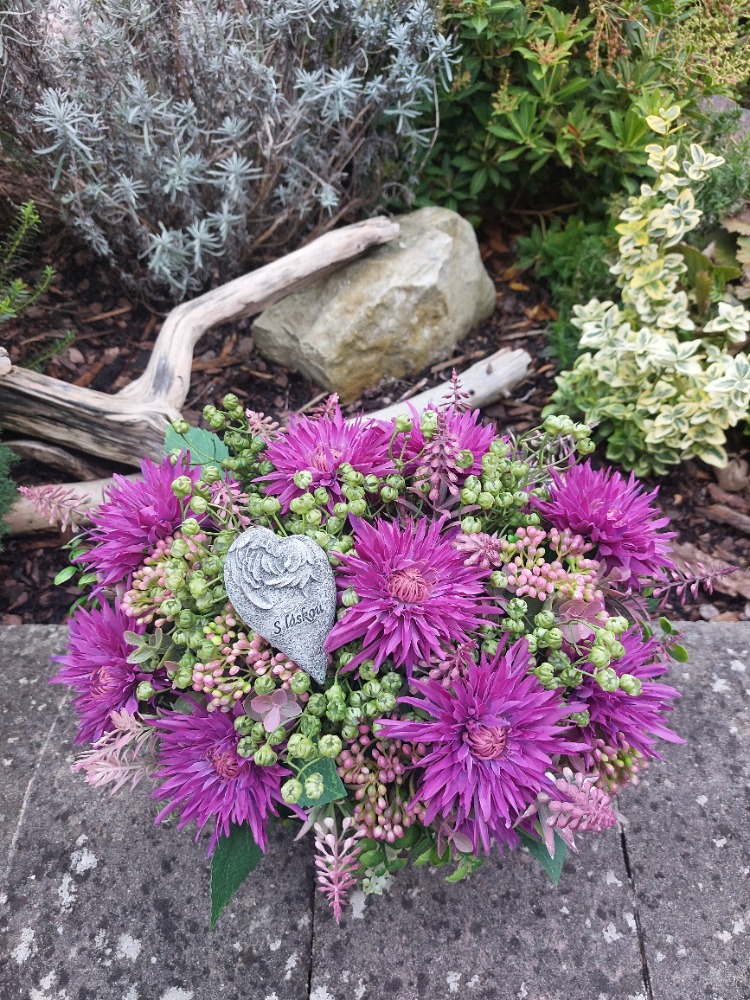 Květinová dekorace v betonovém truhlíku o rozměrech 20cmx10cmx9cm s dekorací 30cm délka, 20cm výška a 20cm šířka. Dekorace je vsazena do aranžovací hmoty pro suché aranžování a je osazena zeleným buxusem, kapradím, fialovou přízdobou, zelenou gypsophilou a fialovými bobulemi v kombinaci květů fialových chryzantém. Doplňkem dekorace je srdce s nápisem S láskou vyrobené z polyresinu. Materiál látkový a umělý.