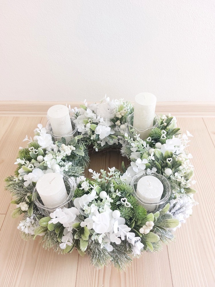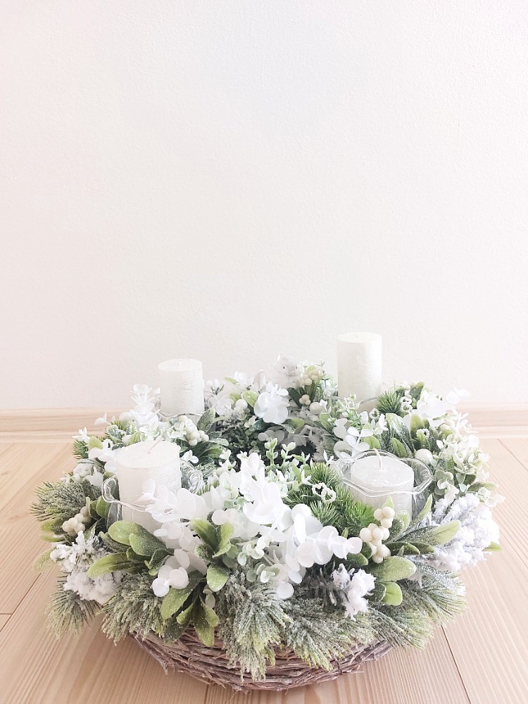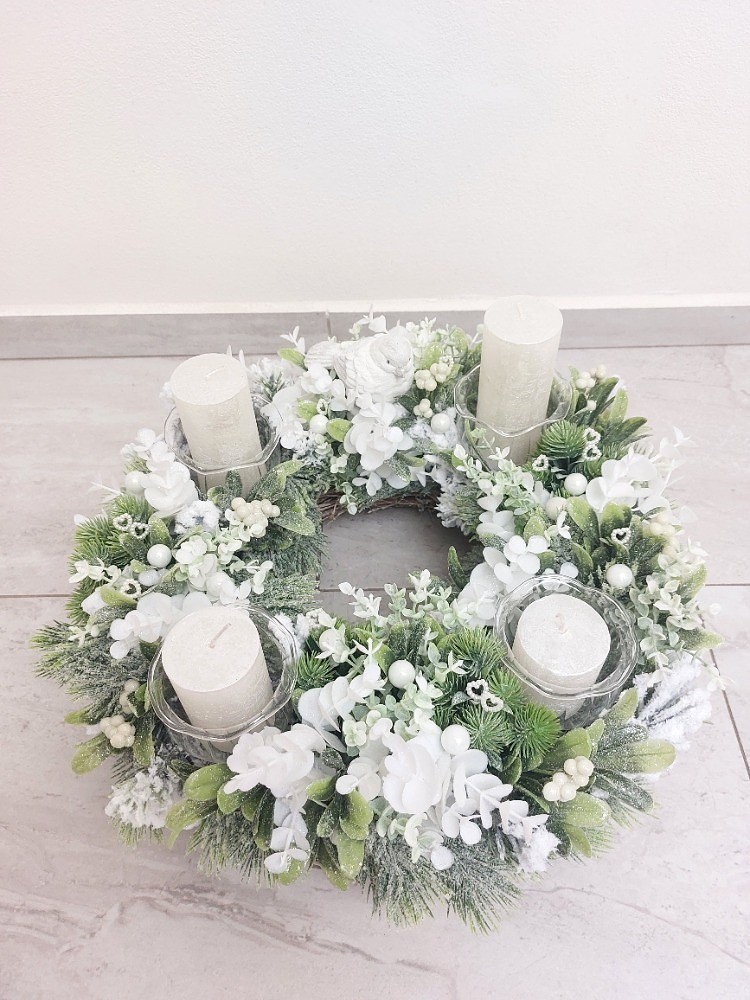 Zimní adventní ručně zdobený věnec na šedém proutěném korpusu o průměru 35cm je osazen umělým ojíněným jehličím, zeleno-bílými lístky, jmelím, bílým eukalyptusem, zelenou přízdobou v kombinaci přízdob, které tvoří umělé bílé kuličky, perleťová srdíčka a ptáček vyrobený z polyresinu. Skleněné zápichy, které slouží na vložení svíček jsou vyrobené českou