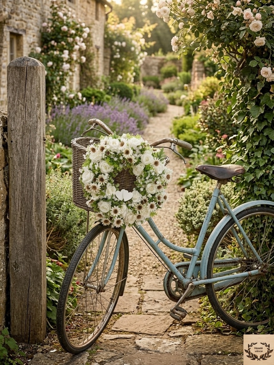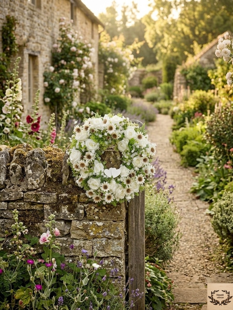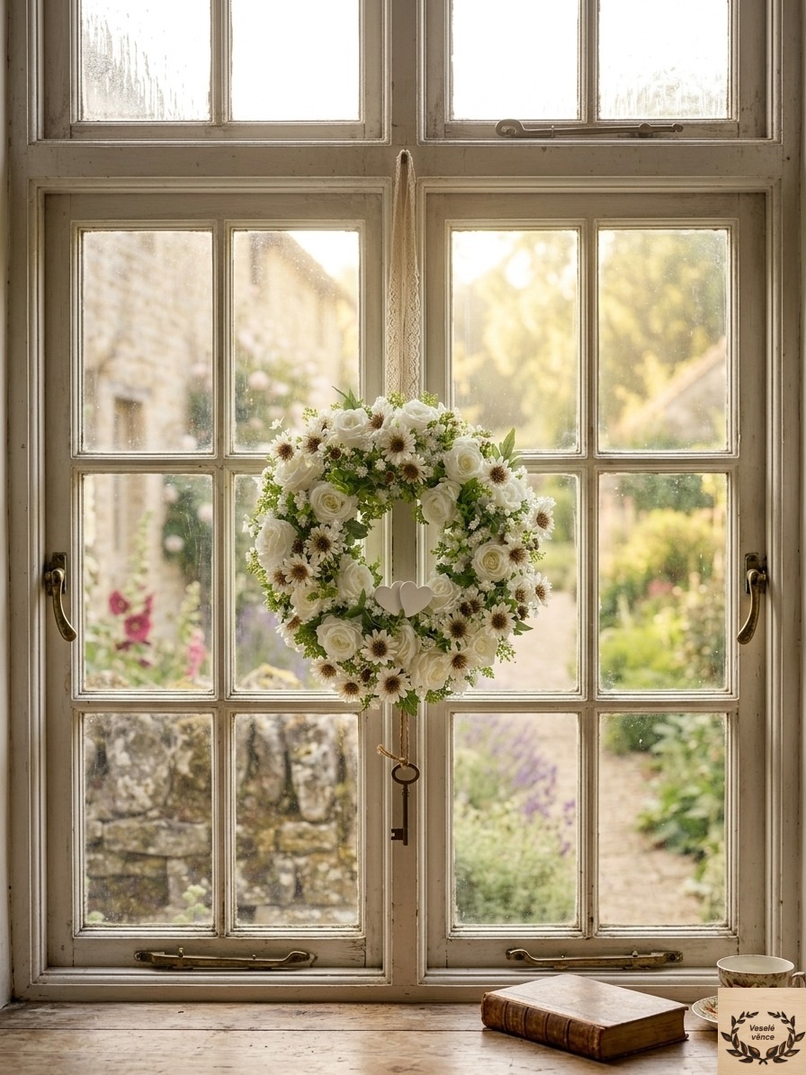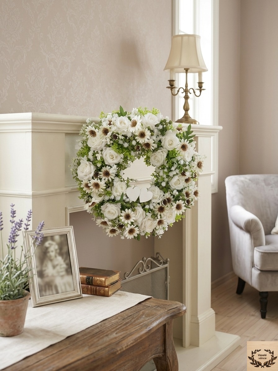 Celoroční ručně zdobený věnec na šedém proutěném korpusu o průměru 30cm s dekorací 33cm. Věnec je osazen drobnými zeleno-bílými lístky, zelenou a bílou gypsophilou v kombinaci bílých květů růžiček a čekanky. Doplňkem věnce jsou bílá dřevěná srdíčka. Materiál umělý, látkový a dřevěný.