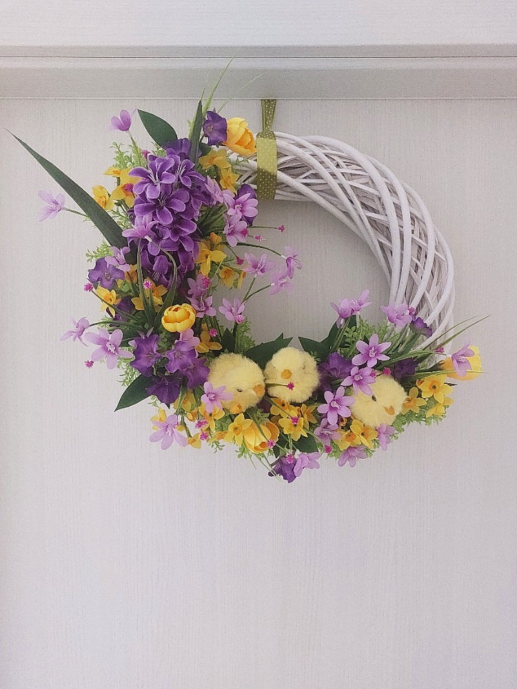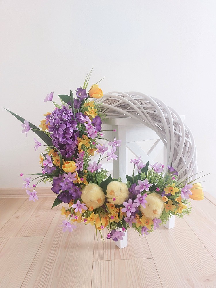 Věnec je osazem drobnými zelenými lístky v kombinaci květů žlutých krokusů, narcisek, drobných fialových a žlutých kvítků, květů fialového plaménku a hyacintu. Doplňkem věnce jsou textilní kuřátka.