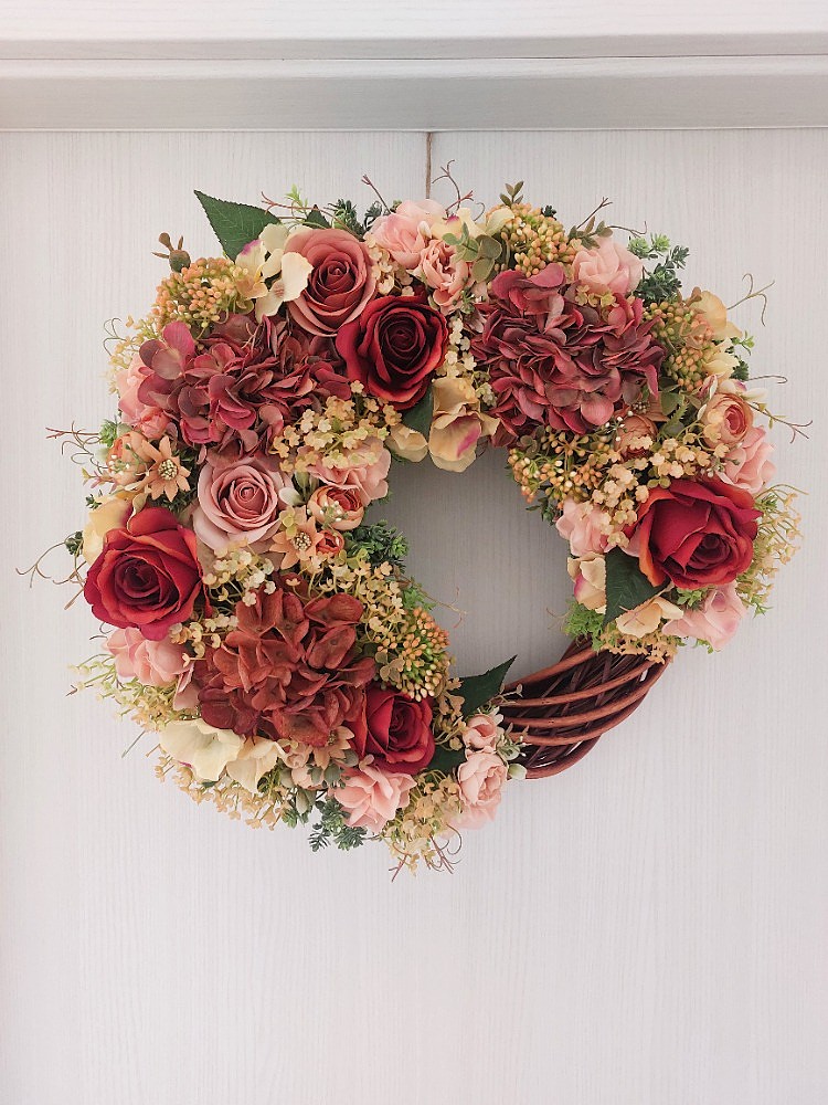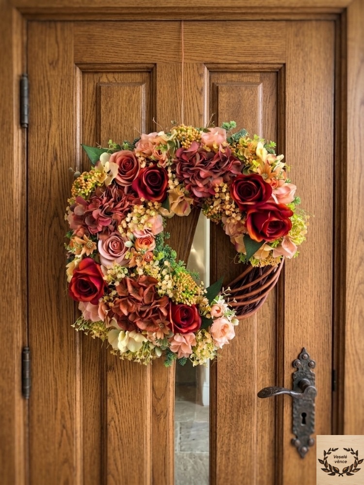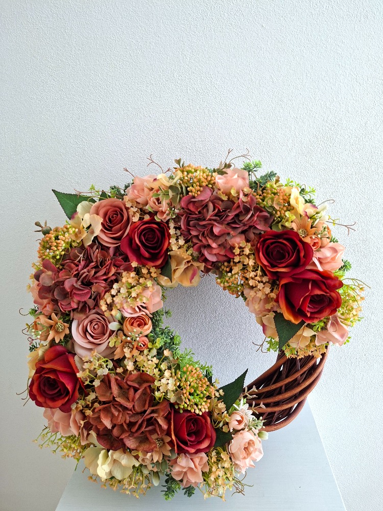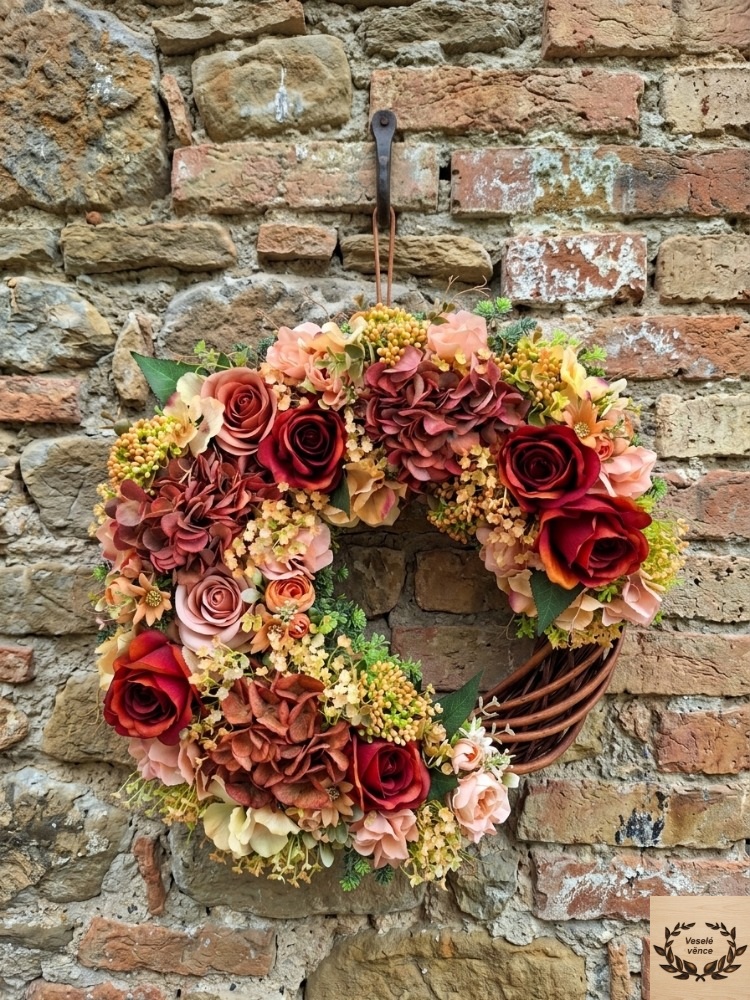 Věnec je osazen zelenou skalničkou, oranžovými bobulemi v kombinaci drobných oranžových kvítků, květů rezavých růží, oranžových ranunculusů, květů rezavé, broskvové a oranžovo-žluté hortenzie. Materiál látkový a umělý.