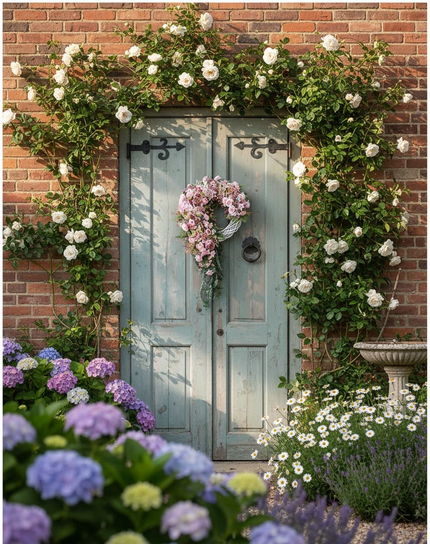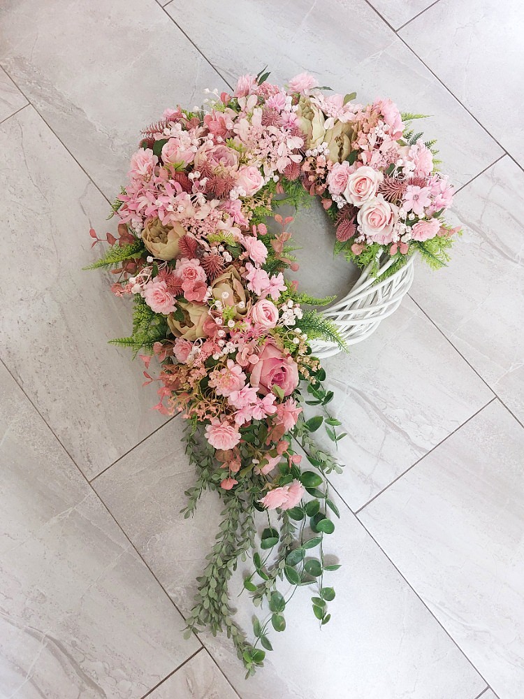 Bohatě ručně zdobený celoroční věnec na bílém proutěném korpusu o průměru 40cm s dekorací 45cm, délka převisu 65cm. Věnec je osazen zelenými lístky, kapradím, zeleným převisem, růžovým eukalyptusem, růžovou gypsophilou, bodláky, růžovým ozdobným koprem v kombinaci květů zeleno-růžových pivoňek, růží a clematisů. Materiál látkový a umělý.
