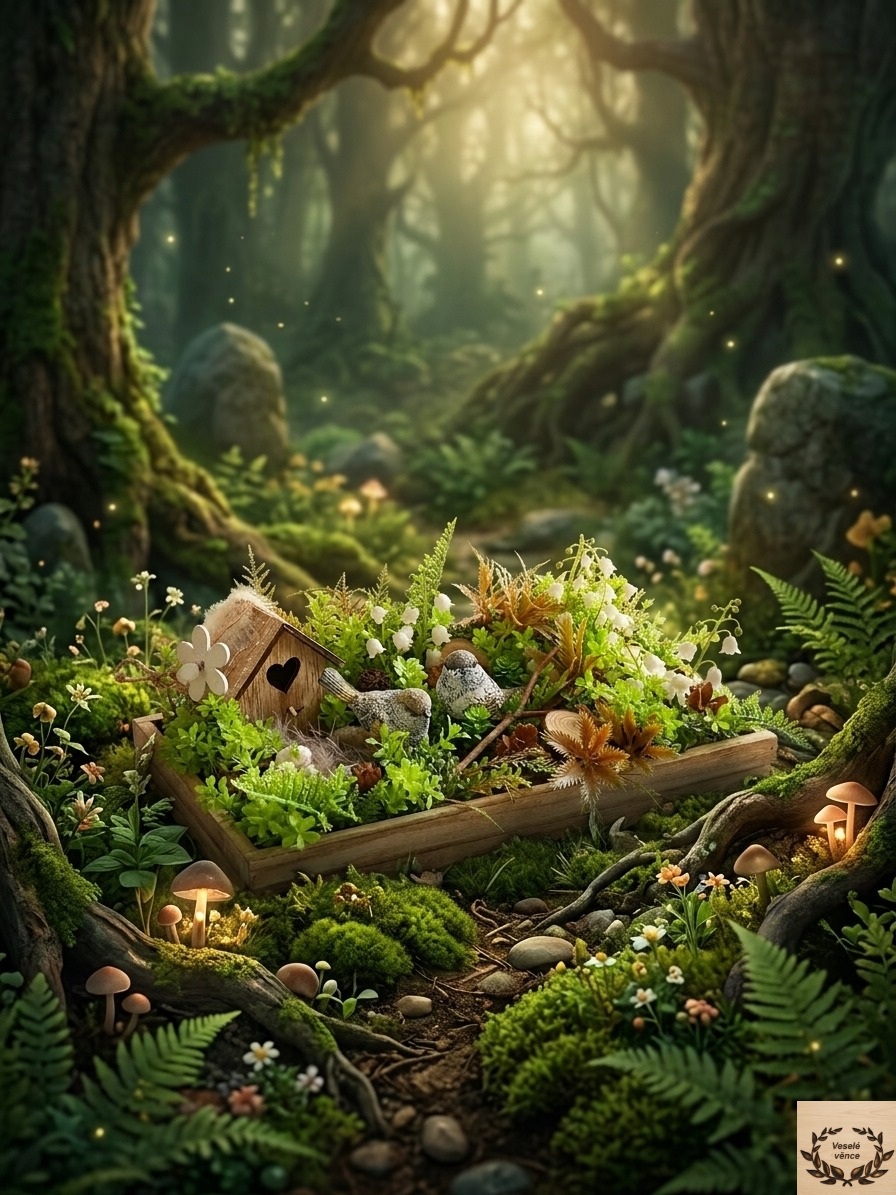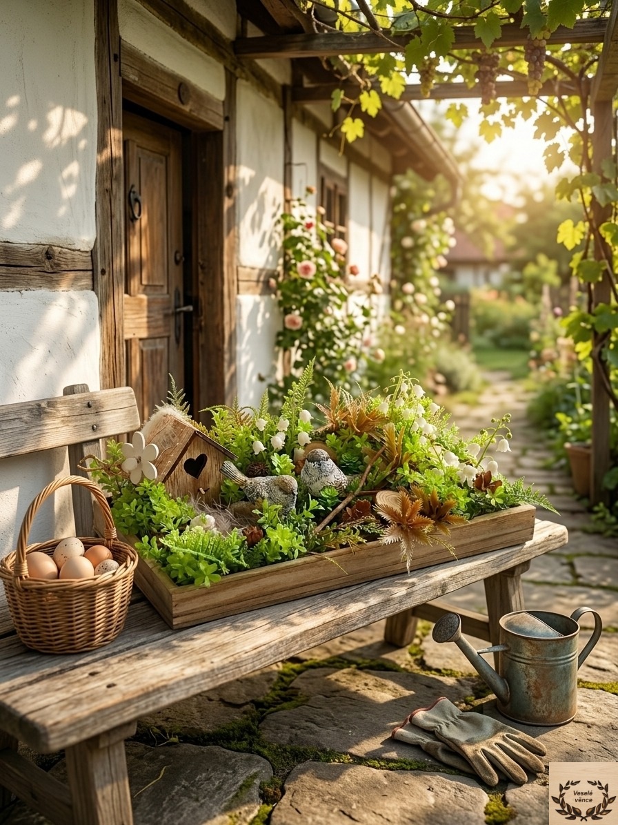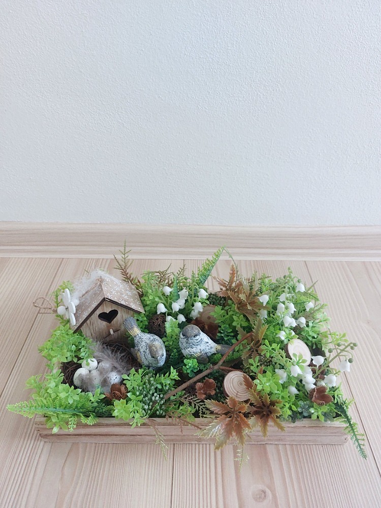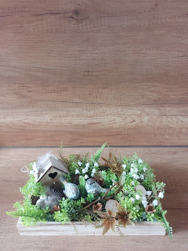 Jarní dekorace na hnědém dřevěném tácu o rozměrech 30cm délka, 18cm šířka a 3cm výška. Dekorace je osazena zeleno-hnědými lístky, mechem, bobulemi, kapradím, květy konvalinek, dřevěnými kolečky a bukvicemi. Doplňkem dekorace jsou ptáčci vyrobení z polyresinu, proutěné ptačí hnízdo a dřevěná budka. Materiál umělý a přírodní.