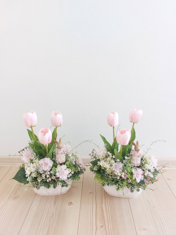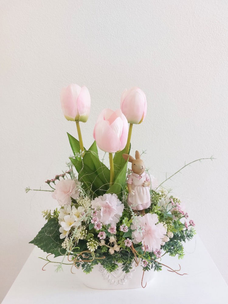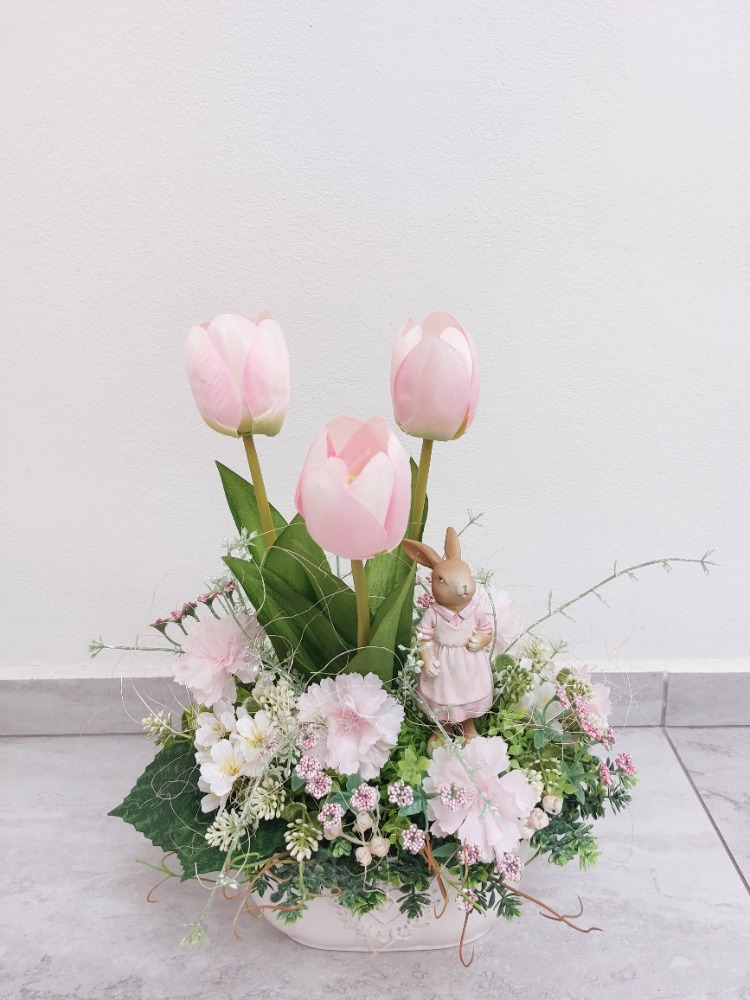 Velikonoční dekorace v bílém keramickém truhlíku o rozměrech 18cm délka, 9cm šířka a 8cm výška s dekorací 27cm délka, 16cm šířka a 30cm výška. Dekorace je vsazena do aranžovací hmoty pro suché aranžování a je osazena zelenou skalničkou, drobnými zeleno-bílými lístky, bílými a růžovými kytičkami, růžovou gypsophilou v kombinaci květů růžových tůlipánů. Doplňkem dekorace je zaječice vyrobená z polyresinu a přírodní sisalové vlákno. Materiál látkový a umělý.