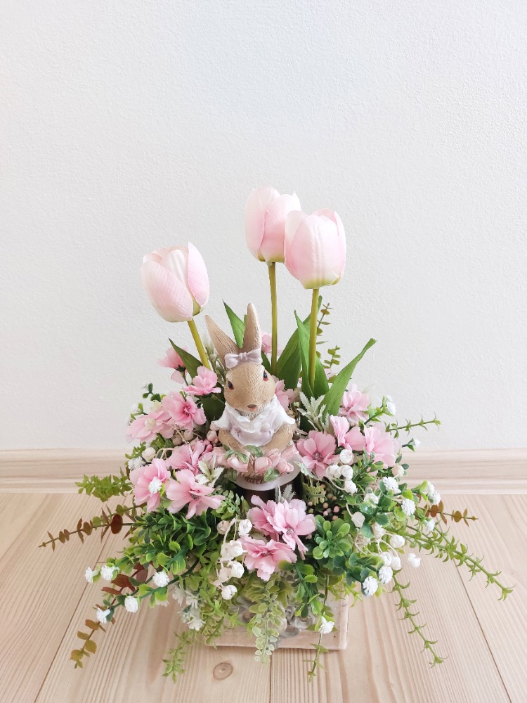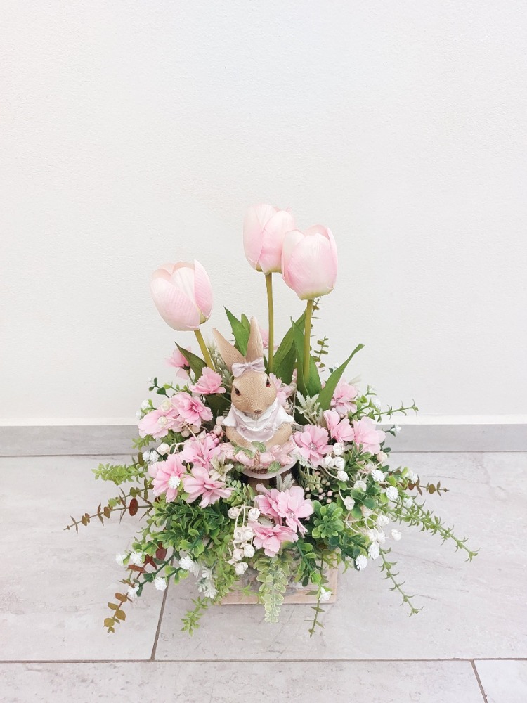 Velikonoční dekorace v hnědém dřevěném šuplíku o rozměrech 13cm šířka, 11cm hloubka a 13cm výška s dekorací 35cm výška, 20cm délka a 20cm šířka. Dekorace je vsazena do aranžovací hmoty pro suché aranžování a je osazena zeleno-hnědým eukalyptusem, zeleným ptačincem, kapradím, drobnými zeleno-bílými lístky, bílou a růžovou gypsophilou v kombinaci drobných růžových květů plaménků a květů tulipánů. Doplňkem dekorace je zaječice vyrobená z polyresinu. Materiál látkový a umělý.