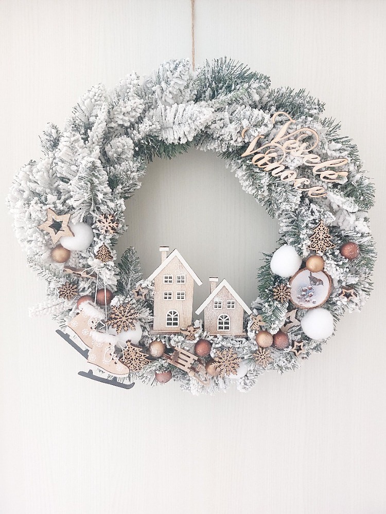 Zimní ručně zdobený věnec na kovovém kruhu s ojíněným jehličím o průměru 45cm. Věnec je doplněn mixem přízdob, které tvoří dřevěné domečky, sáňky, brusle, vločky, stromečky, hvězdičky, oválek s obrázkem sýkorky, tmavě a světle hnědé plastové kuličky a vatové sněhové koule. Doplňkem věnce je dřevěný nápis Veselé vánoce. Materiál umělý a přírodní.