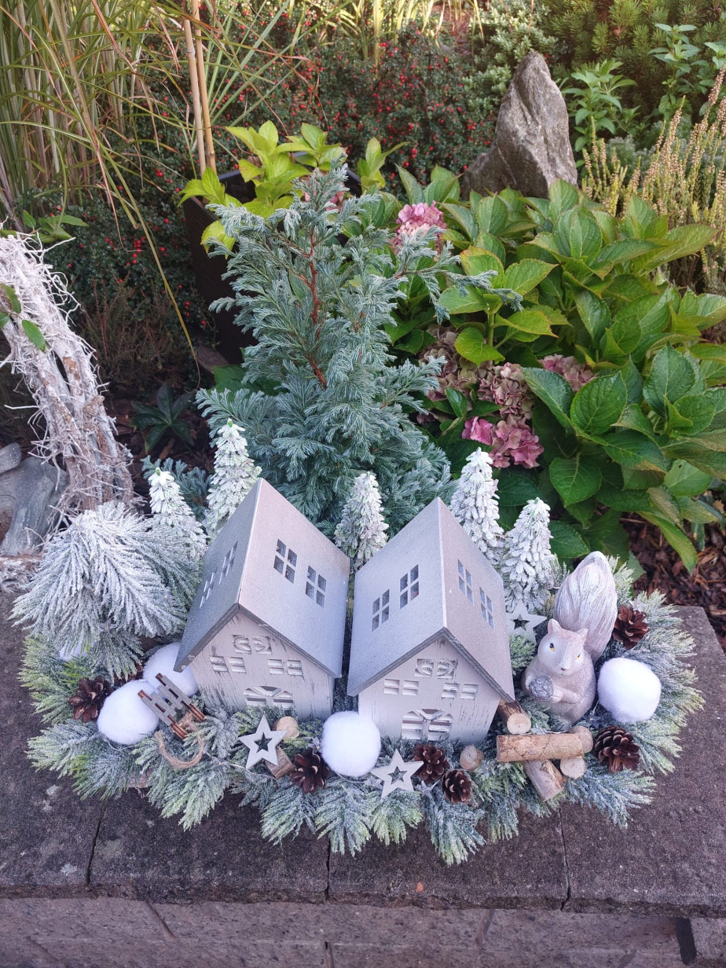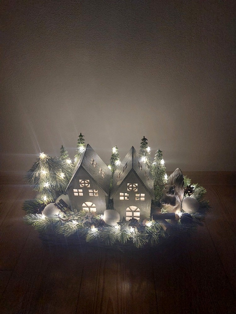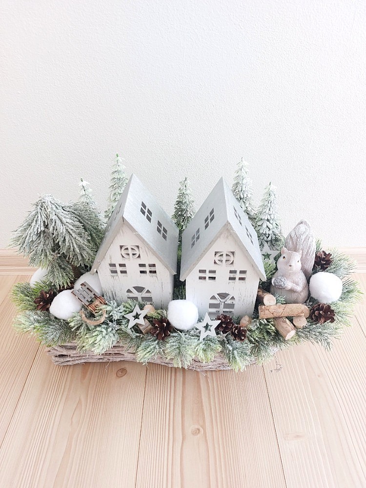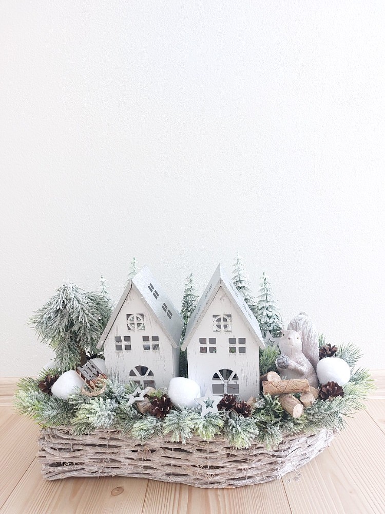 Zimní dekorace v šedé proutěné loďce o rozměrech s dekorací 60cm délka, 20cm šířka a 30cm výška. Dekorace je vsazena do aranžovací hmoty pro suché aranžování a je osazena ojíněným jehličím, umělými stromečky, sněhovými koulemi, přírodními šiškami, klacíky, kolečky, dřevěnými sáňkami, a hvězdičkami. Doplňkem dekorace je veverka vyrobená z polyresinu, dřevěné svítící domy a světýlka ve tvaru hvězdiček na tužkové baterie. Materiál umělý a přírodní.