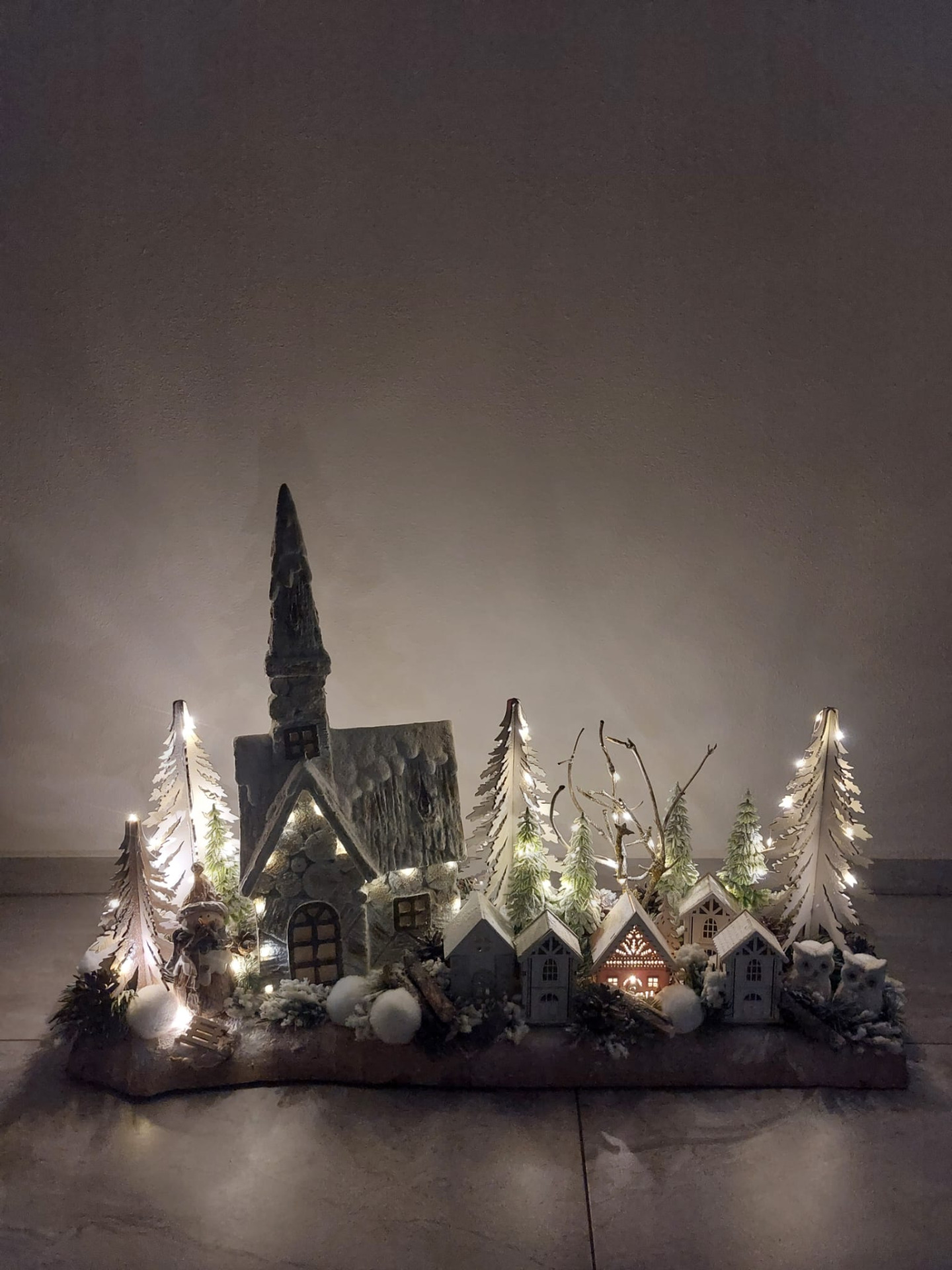 Zimní vesnička na masivním jasanovém dřevě o rozměrech 85cm délka, 25cm šířka a 40cm výška. Dominantou dekorace je svítící kostel o rozměrech 53cm výška, 24cm šířka a 13cm hloubka. Kostel je vyrobený z odolné magnéziové keramiky a celá dekorace je doplněná umělými a přírodními přízdobami, které tvoří dřevěné chaloupky, sáňky, přírodní šišky, klacíky, stromečky, sněhové koule, ojíněné jehličí, sněhulák a sovy vyrobené z polyresinu. Součástí dekorace jsou světýlka na tužkové baterie. Celková dekorace váží 8.4 kg proto v případě zájmu doporučujeme osobní převzetí nebo poslat dopravou PPL.
