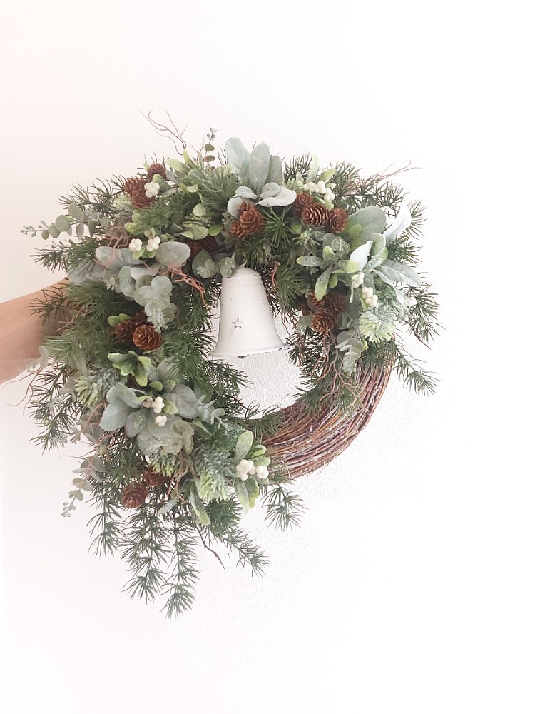 Zimní ručně zdobený věnec na hnědém proutěném korpusu o průměru 40cm. Věnec je osazen větvemi modřínu, ojíněnou jedlí, jmelím, listy starčeku a eukalyptusem. Doplňkem věnce je bílý kovový zvon. Materiál umělý a přírodní.